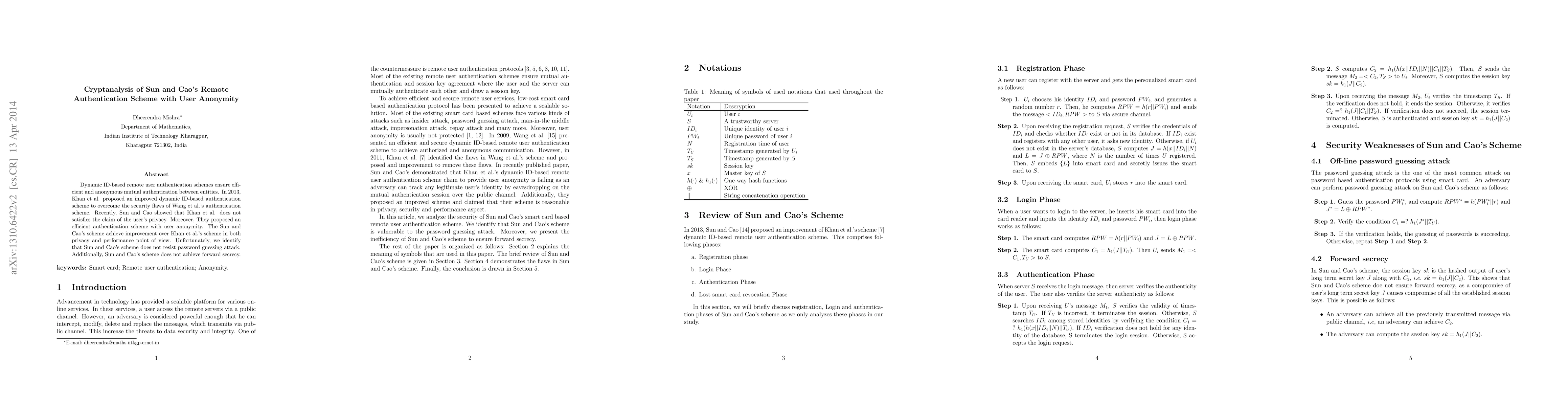 Dynamic ID-based remote user authentication schemes ensure efficient and anonymous mutual authentication between entities. In 2013, Khan et al. proposed an improved dynamic ID-based authentication scheme to overcome the security flaws of Wang et al.'s authentication scheme. Recently, Sun and Cao showed that Khan et al. does not satisfies the claim of the user's privacy and proposed an efficient authentication scheme with user anonymity. The Sun and Cao's scheme achieve improvement over Khan et al.'s scheme in both privacy and performance point of view. Unfortunately, we identify that Sun and Cao's scheme does not resist password guessing attack. Additionally, Sun and Cao's scheme does not achieve forward secrecy.