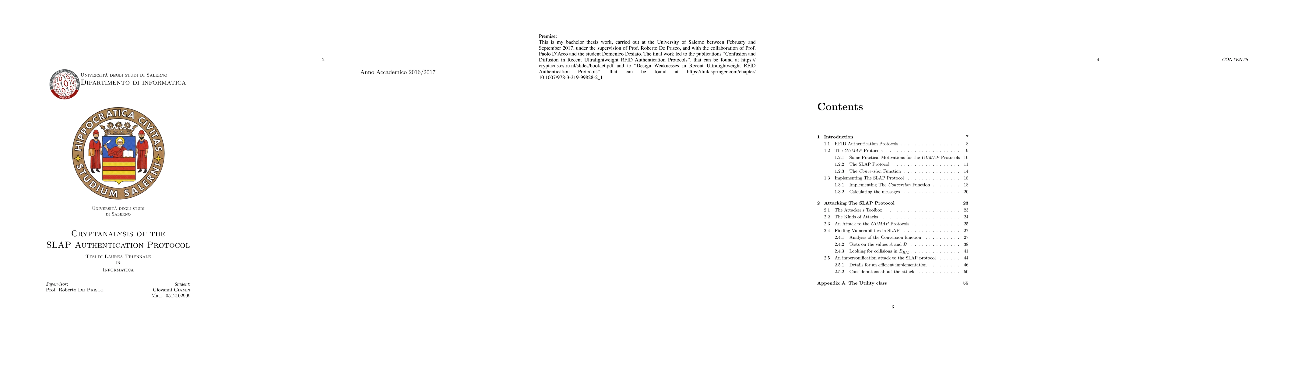 RFID (Radio Frequency Identification) is a powerful technology that, due to its numerous advantages, is supposed to replace the various identification systems such as barcodes or magnetic stripes in a short time. There are three devices involved in an RFID protocol: a Reader, a Tag, and a back-end Database. One of the key factors for the RFID technology is that, in order to be used on large scale, the price of the Tags has to be cheap: it cannot be expensive because who is supposed to use it would need a great amount of them, furthermore, Tags must have very small dimensions. The low-cost nature of such devices implies the impossibility to use standard cryptographic protocols on them, furthermore, Ultra-Lightweight Tags even lack the necessary computational power to generate random numbers. Many experts are trying to build secure protocols that involve just simple bitwise logical operations for these Tags, but, unfortunately, each of these protocols turned out to be vulnerable to some serious attack after short time from publication. The need for a secure RFID authentication protocol today seems more urgent than ever, because this technology is already used for security purposes, such as electronic passports. The challenge to build a secure protocol for Ultra-Lightweight RFID systems is so hard that in several years no one has been able to build one. In this thesis we analyze in great detail a recently proposed protocol for Ultra-Lightweight RFID systems called SLAP, with the aim of finding new vulnerabilities. SLAP has already been violated (along with a set of similar protocols) by Safkhani and Bagheri, that have recently published a de-synchronization attack. At the end of our analysis, we will propose an impersonification attack to the protocol, along with a fix for our attack and some considerations on the attacks proposed on this kind of protocols.