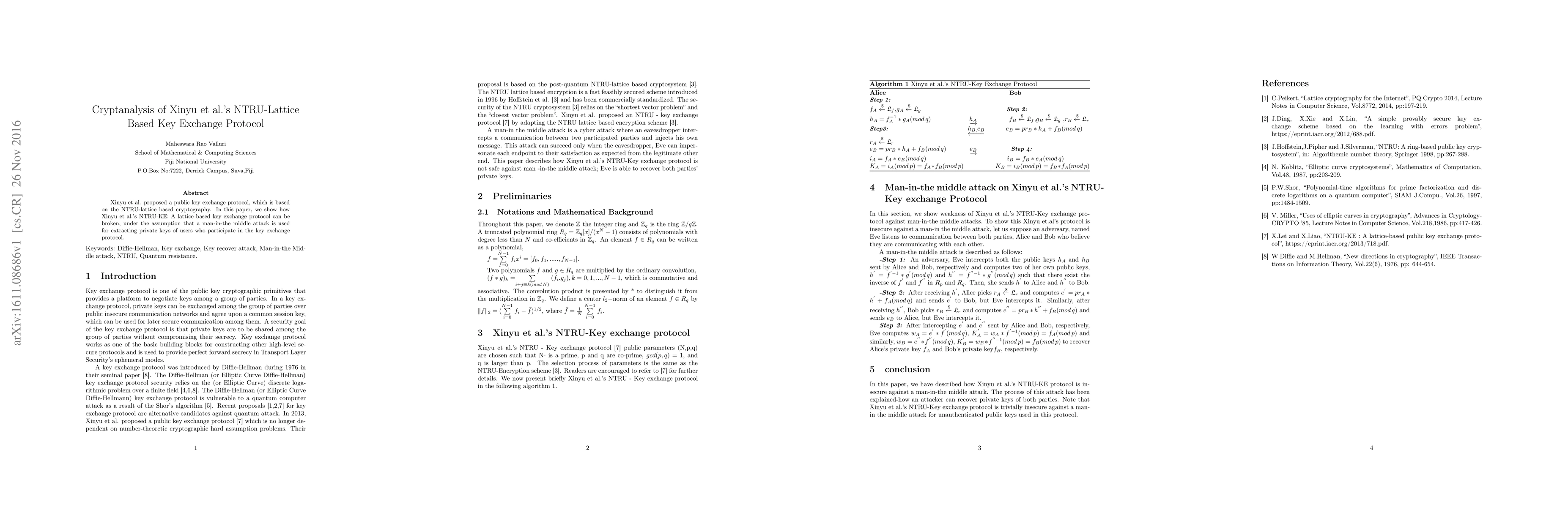 Summary: This paper demonstrates a cryptanalysis of Xinyu et al.'s NTRU-lattice based key exchange protocol, revealing vulnerabilities that can be exploited through man-in-the-middle attacks to extract private keys from users.