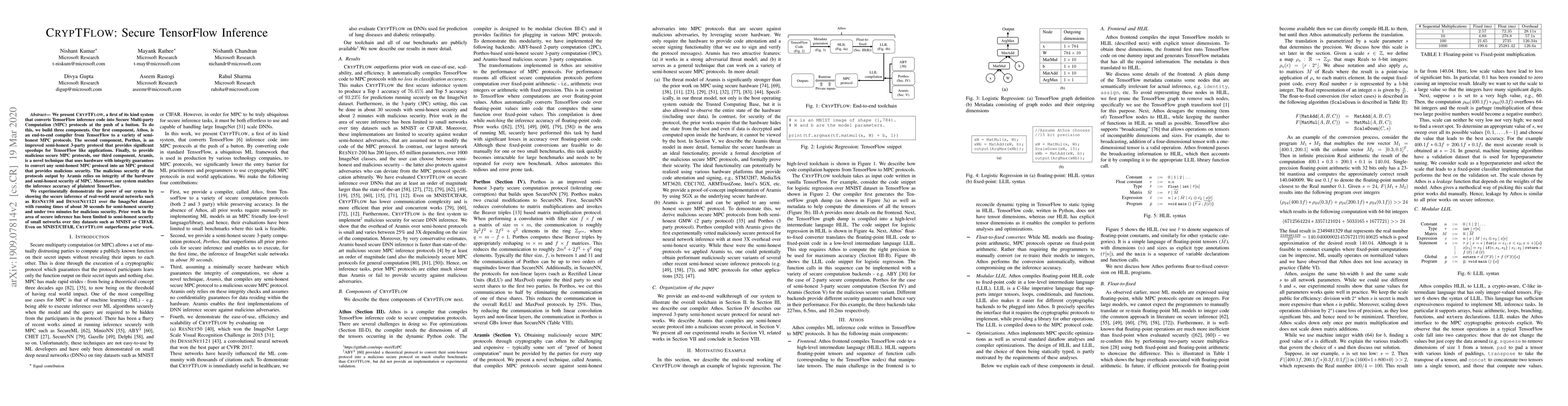 We present CrypTFlow, a first of its kind system that converts TensorFlow inference code into Secure Multi-party Computation (MPC) protocols at the push of a button. To do this, we build three components. Our first component, Athos, is an end-to-end compiler from TensorFlow to a variety of semi-honest MPC protocols. The second component, Porthos, is an improved semi-honest 3-party protocol that provides significant speedups for TensorFlow like applications. Finally, to provide malicious secure MPC protocols, our third component, Aramis, is a novel technique that uses hardware with integrity guarantees to convert any semi-honest MPC protocol into an MPC protocol that provides malicious security. The malicious security of the protocols output by Aramis relies on integrity of the hardware and semi-honest security of MPC. Moreover, our system matches the inference accuracy of plaintext TensorFlow. We experimentally demonstrate the power of our system by showing the secure inference of real-world neural networks such as ResNet50 and DenseNet121 over the ImageNet dataset with running times of about 30 seconds for semi-honest security and under two minutes for malicious security. Prior work in the area of secure inference has been limited to semi-honest security of small networks over tiny datasets such as MNIST or CIFAR. Even on MNIST/CIFAR, CrypTFlow outperforms prior work.