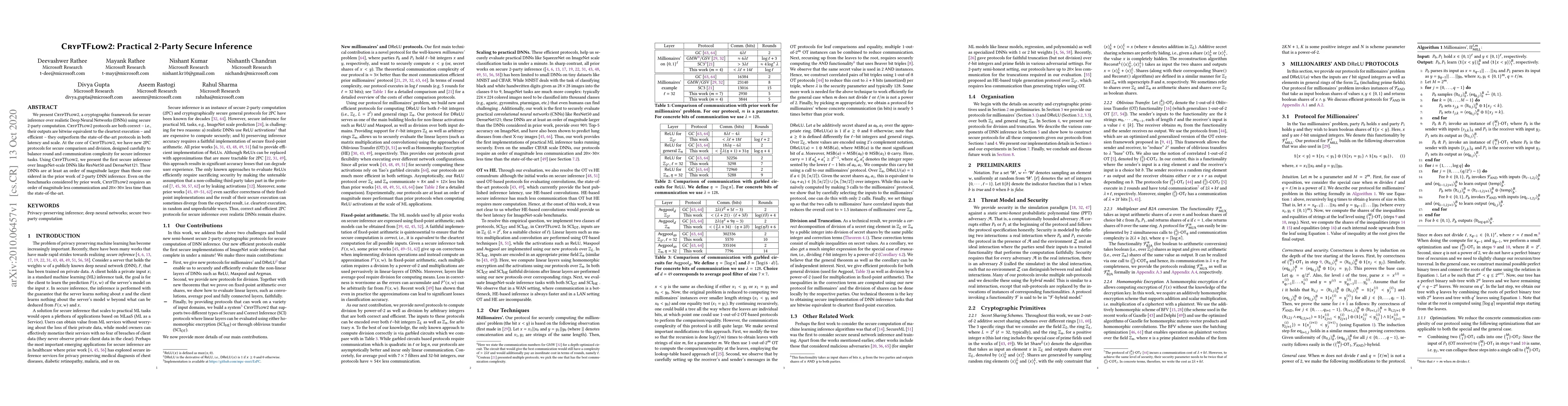 CrypTFlow2 is a cryptographic framework for secure 2-party computation that enables practical secure inference over large Deep Neural Networks like ResNet50 and DenseNet121, outperforming existing protocols in efficiency and scalability. It introduces novel protocols for secure comparison and division to achieve optimal performance.