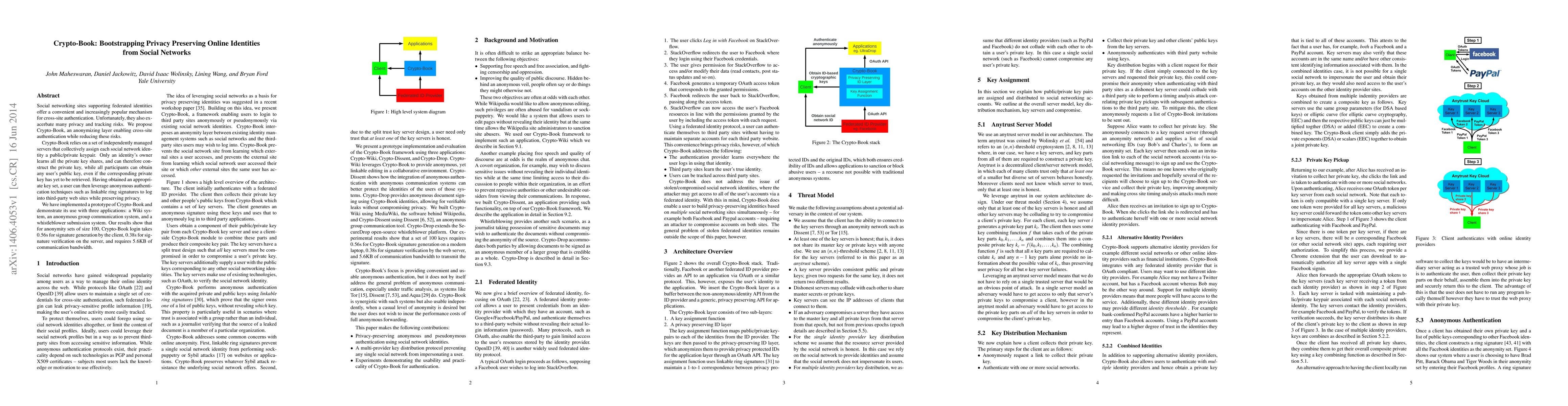 Crypto-Book proposes an anonymizing layer to enable secure cross-site authentication while mitigating privacy risks associated with federated identities on social networks. The system uses independently managed servers to assign public/private keypairs to social network identities, ensuring only the identity owner can reconstruct the private key, thus preserving user privacy.