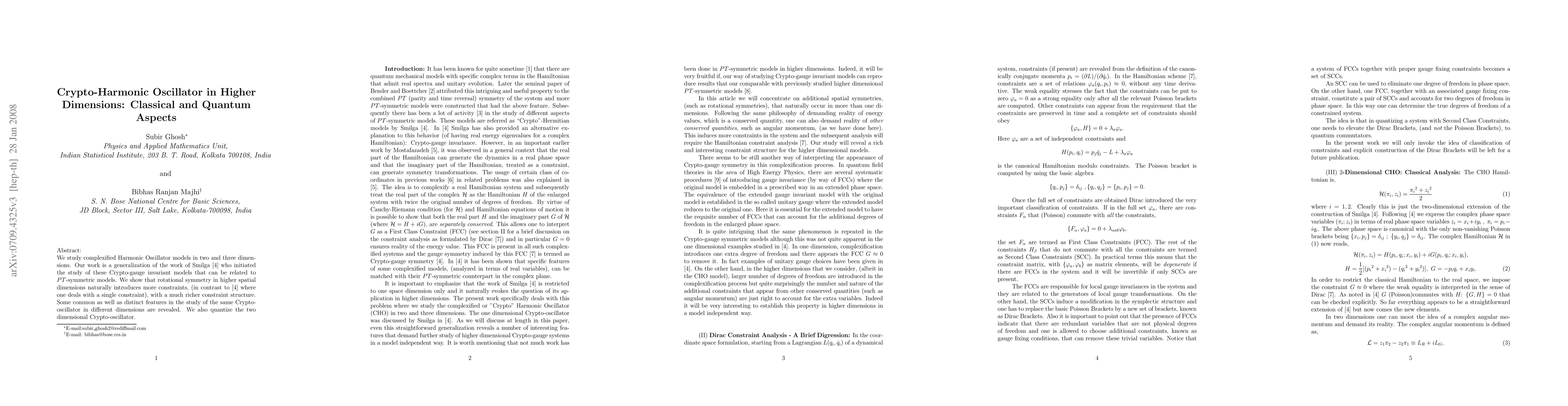 This paper generalizes the study of complexified Harmonic Oscillator models in higher dimensions, revealing a richer constraint structure due to rotational symmetry compared to lower dimensions. It also quantizes the two-dimensional Crypto-oscillator, extending the work of Smilga on Crypto-gauge invariant models.
