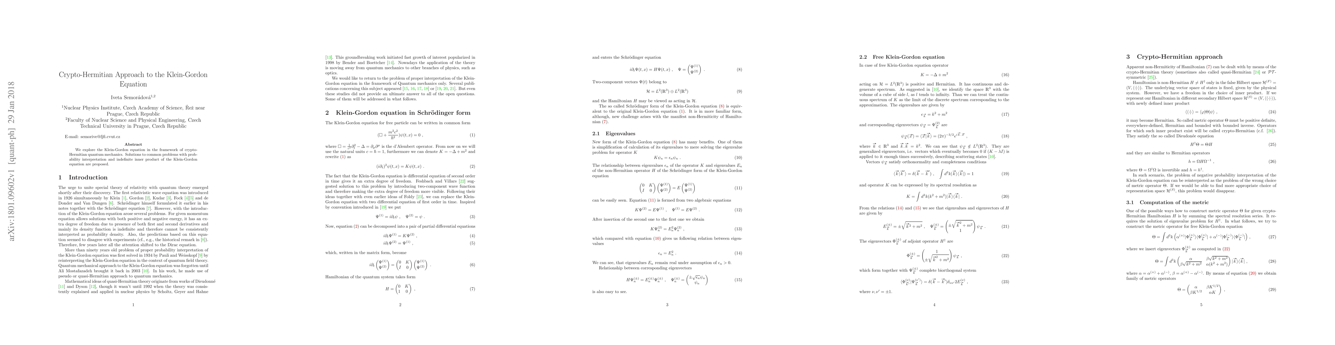 Summary: This paper investigates the Klein-Gordon equation using crypto-Hermitian quantum mechanics, offering solutions to its conventional problems and proposing a new interpretation with an indefinite inner product.