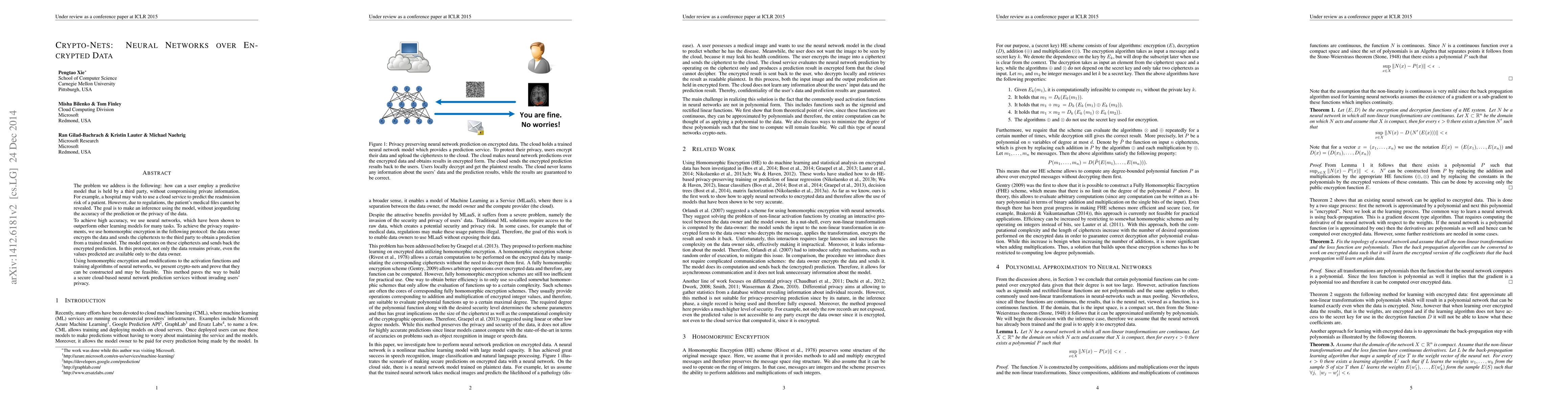 Crypto-Nets employs homomorphic encryption and modified neural networks to enable third-party predictive modeling on encrypted data, ensuring both prediction accuracy and user privacy. This approach allows secure cloud-based services to infer outcomes without compromising sensitive information.
