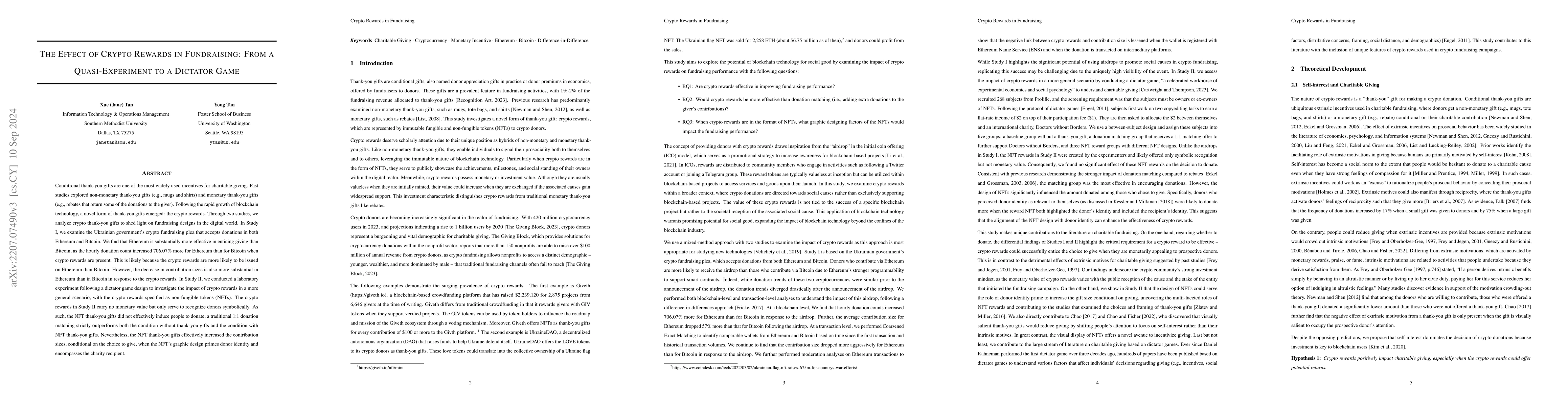 This study investigates the impact of crypto rewards on donations to a Ukrainian fundraising campaign, finding that while crypto rewards increase donation counts, they decrease average donation sizes. Specifically, Ethereum-based rewards show a significantly stronger effect on boosting donation counts compared to Bitcoin-based rewards, likely due to Ethereum's higher programmability.
