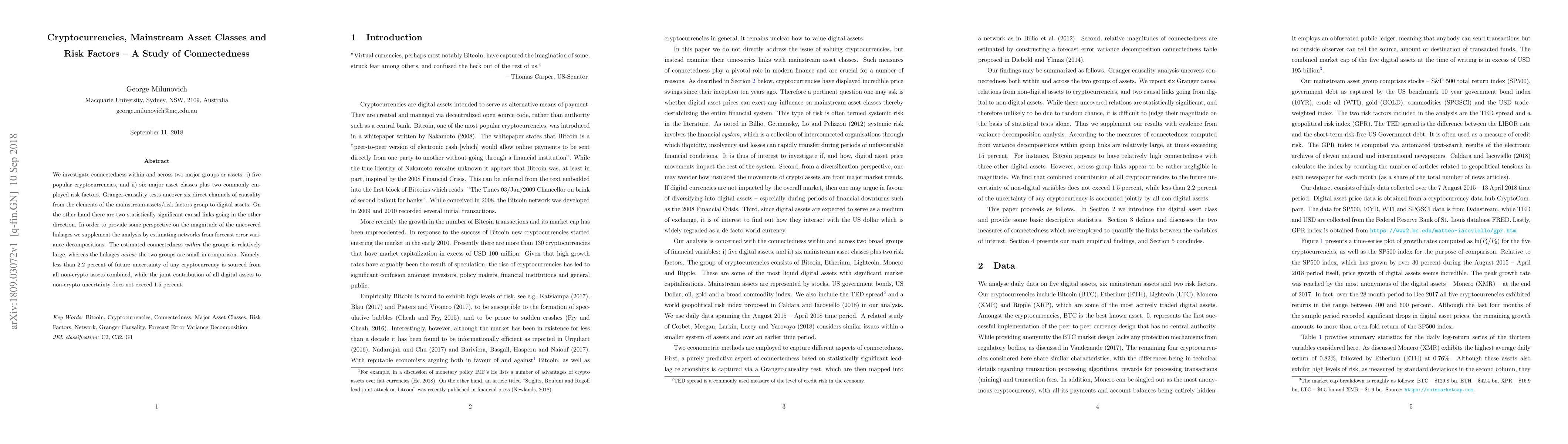 A study found that cryptocurrencies are connected to mainstream assets and risk factors through limited channels, with most uncertainty coming from within the cryptocurrency group itself. The connections between digital assets and non-crypto assets are also small, suggesting a limited link between the two groups.