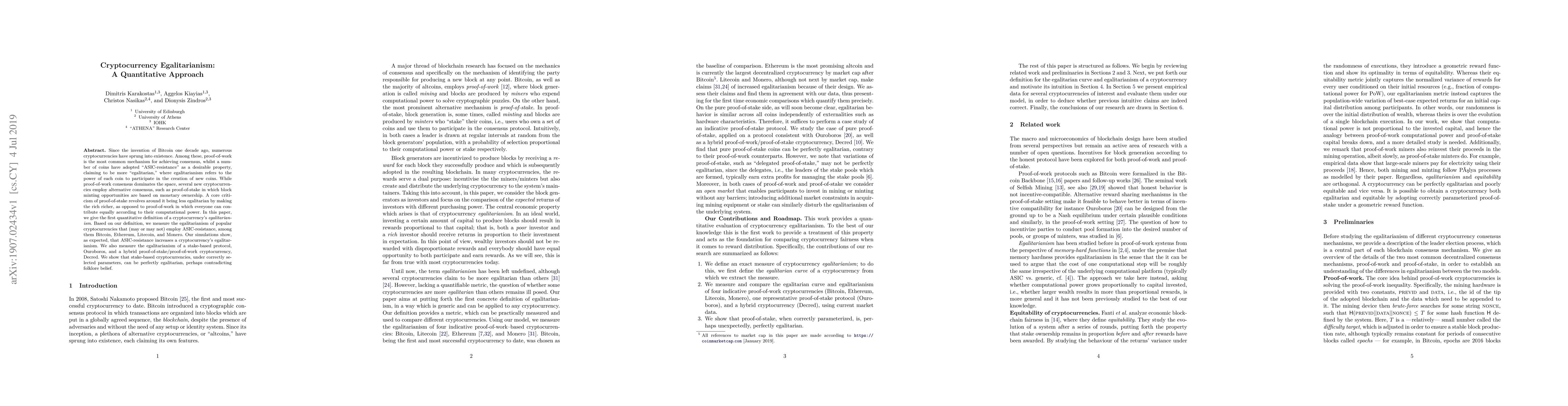 Since the invention of Bitcoin one decade ago, numerous cryptocurrencies have sprung into existence. Among these, proof-of-work is the most common mechanism for achieving consensus, whilst a number of coins have adopted "ASIC-resistance" as a desirable property, claiming to be more "egalitarian,"S where egalitarianism refers to the power of each coin to participate in the creation of new coins. While proof-of-work consensus dominates the space, several new cryptocurrencies employ alternative consensus, such as proof-of-stake in which block minting opportunities are based on monetary ownership. A core criticism of proof-of-stake revolves around it being less egalitarian by making the rich richer, as opposed to proof-of-work in which everyone can contribute equally according to their computational power. In this paper, we give the first quantitative definition of a cryptocurrency's \emph{egalitarianism}. Based on our definition, we measure the egalitarianism of popular cryptocurrencies that (may or may not) employ ASIC-resistance, among them Bitcoin, Ethereum, Litecoin, and Monero. Our simulations show, as expected, that ASIC-resistance increases a cryptocurrency's egalitarianism. We also measure the egalitarianism of a stake-based protocol, Ouroboros, and a hybrid proof-of-stake/proof-of-work cryptocurrency, Decred. We show that stake-based cryptocurrencies, under correctly selected parameters, can be perfectly egalitarian, perhaps contradicting folklore belief.