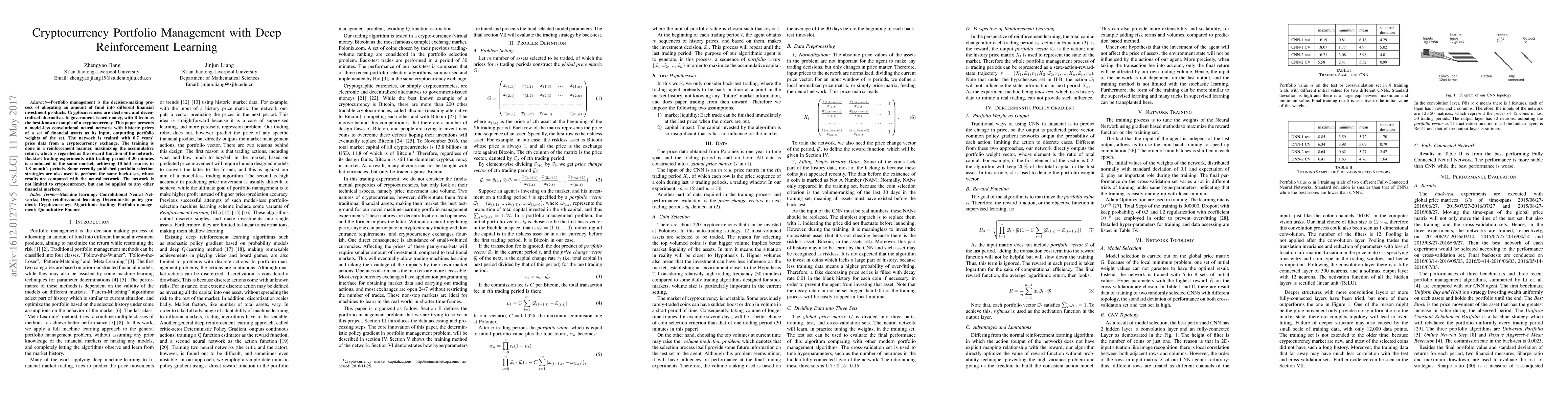 This paper proposes a deep reinforcement learning model using a convolutional neural network to manage cryptocurrency portfolios, trained on historic price data to maximize returns. The model achieved 10-fold returns in 1.8 months, outperforming other portfolio selection strategies.