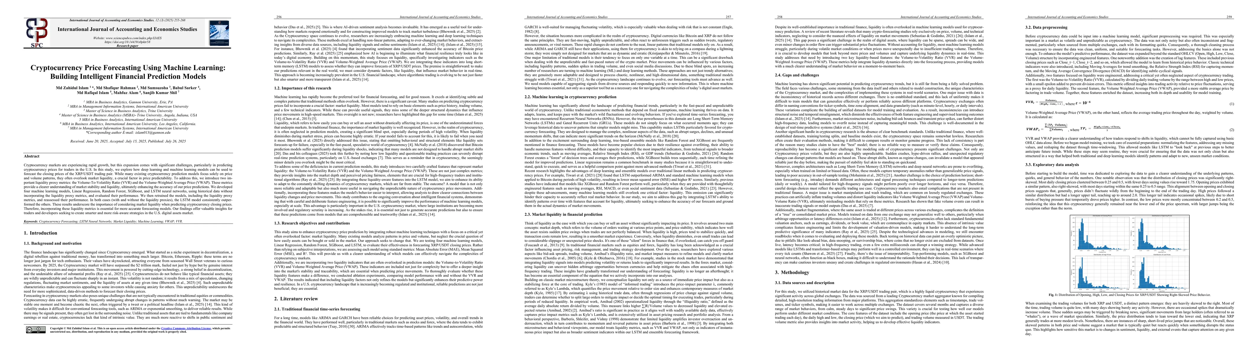This research demonstrates that incorporating liquidity proxy metrics, Volume-To-Volatility Ratio (VVR) and Volume-Weighted Average Price (VWAP), enhances the accuracy of machine learning models, particularly LSTM neural networks, in forecasting XRP/USDT cryptocurrency closing prices. The study emphasizes the importance of market liquidity for more reliable prediction models in the U.S. digital assets market.
