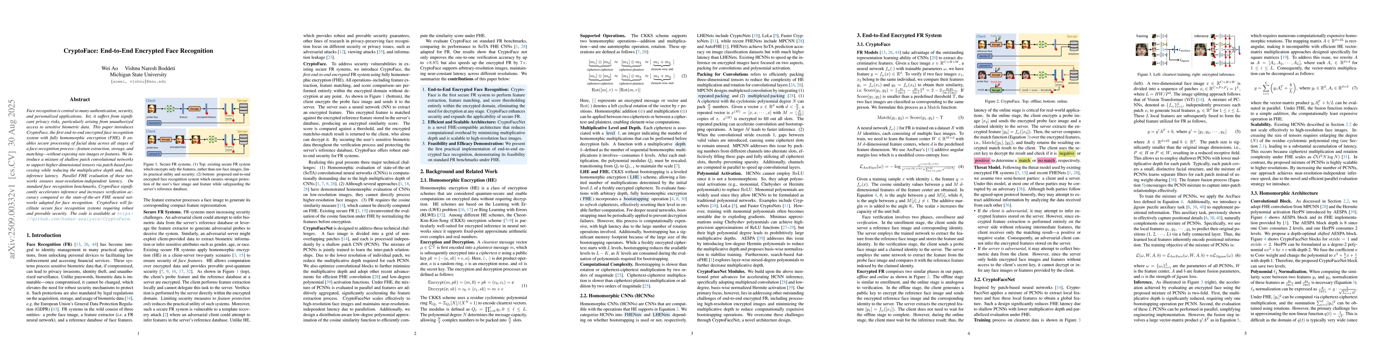 Face recognition is central to many authentication, security, and personalized applications. Yet, it suffers from significant privacy risks, particularly arising from unauthorized access to sensitive biometric data. This paper introduces CryptoFace, the first end-to-end encrypted face recognition system with fully homomorphic encryption (FHE). It enables secure processing of facial data across all stages of a face-recognition process--feature extraction, storage, and matching--without exposing raw images or features. We introduce a mixture of shallow patch convolutional networks to support higher-dimensional tensors via patch-based processing while reducing the multiplicative depth and, thus, inference latency. Parallel FHE evaluation of these networks ensures near-resolution-independent latency. On standard face recognition benchmarks, CryptoFace significantly accelerates inference and increases verification accuracy compared to the state-of-the-art FHE neural networks adapted for face recognition. CryptoFace will facilitate secure face recognition systems requiring robust and provable security. The code is available at https://github.com/human-analysis/CryptoFace.