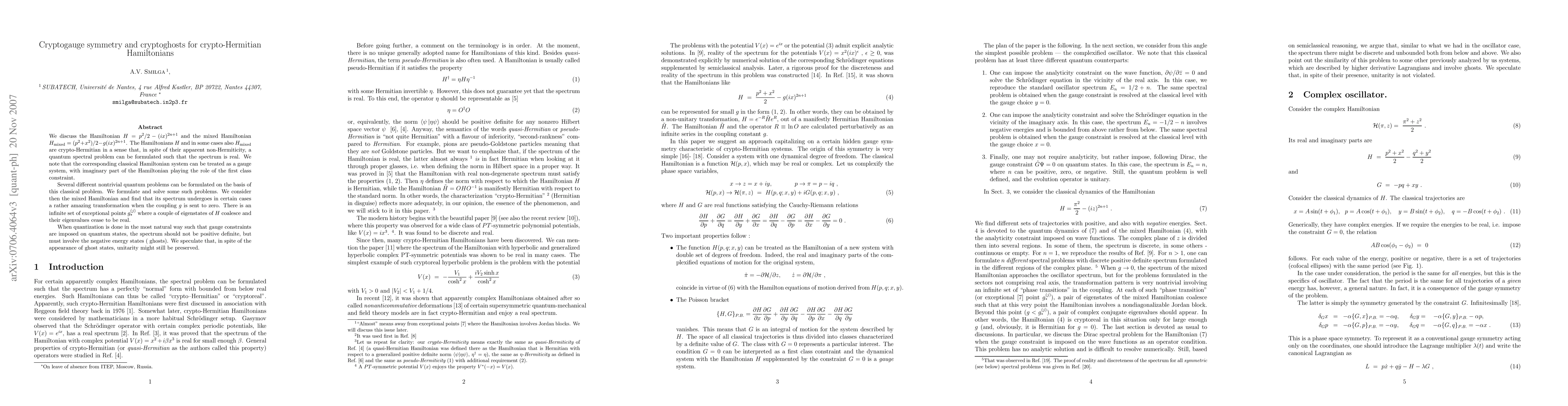 This paper explores crypto-Hermitian Hamiltonians, specifically H = p^2/2 - (ix)^{2n+1} and its mixed variant, revealing that despite complex potentials, their spectra remain real. It discusses the gauge symmetry of the classical system and the emergence of "cryptoghosts" in quantum quantization, speculating on the preservation of unitarity despite these negative energy states.