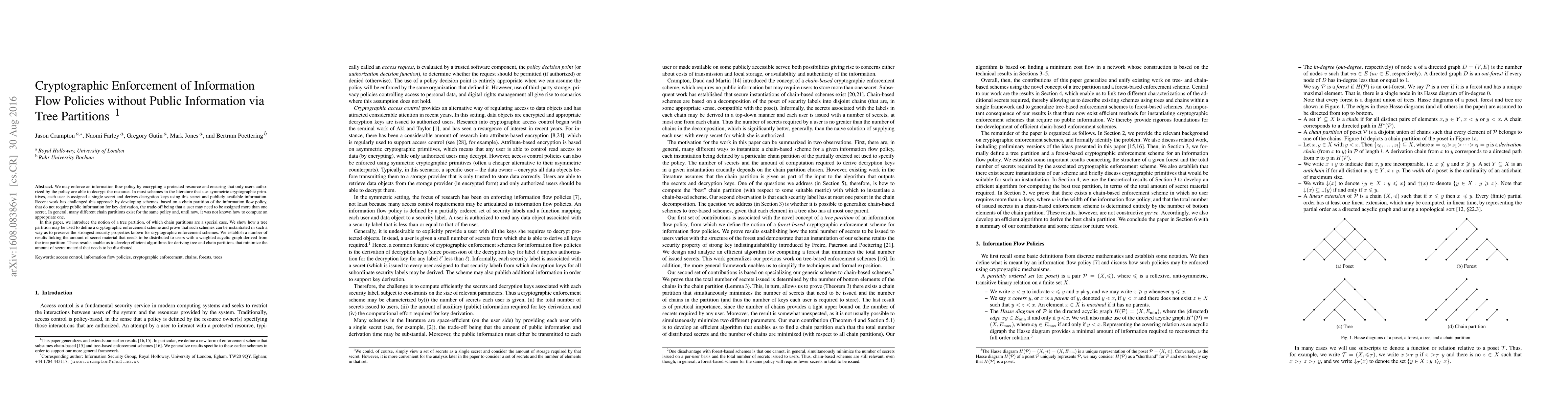 We may enforce an information flow policy by encrypting a protected resource and ensuring that only users authorized by the policy are able to decrypt the resource. In most schemes in the literature that use symmetric cryptographic primitives, each user is assigned a single secret and derives decryption keys using this secret and publicly available information. Recent work has challenged this approach by developing schemes, based on a chain partition of the information flow policy, that do not require public information for key derivation, the trade-off being that a user may need to be assigned more than one secret. In general, many different chain partitions exist for the same policy and, until now, it was not known how to compute an appropriate one. In this paper, we introduce the notion of a tree partition, of which chain partitions are a special case. We show how a tree partition may be used to define a cryptographic enforcement scheme and prove that such schemes can be instantiated in such a way as to preserve the strongest security properties known for cryptographic enforcement schemes. We establish a number of results linking the amount of secret material that needs to be distributed to users with a weighted acyclic graph derived from the tree partition. These results enable us to develop efficient algorithms for deriving tree and chain partitions that minimize the amount of secret material that needs to be distributed.