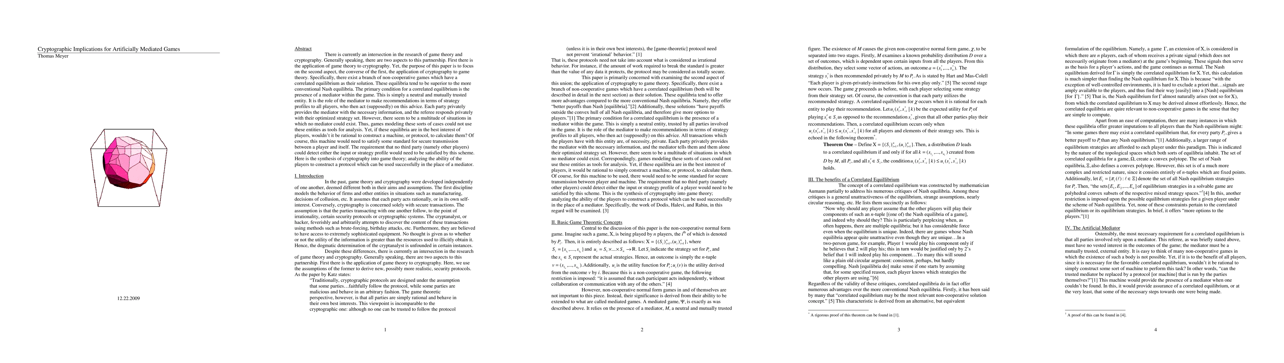 There is currently an intersection in the research of game theory and cryptography. Generally speaking, there are two aspects to this partnership. First there is the application of game theory to cryptography. Yet, the purpose of this paper is to focus on the second aspect, the converse of the first, the application of cryptography to game theory. Chiefly, there exist a branch of non-cooperative games which have a correlated equilibrium as their solution. These equilibria tend to be superior to the conventional Nash equilibria. The primary condition for a correlated equilibrium is the presence of a mediator within the game. This is simply a neutral and mutually trusted entity. It is the role of the mediator to make recommendations in terms of strategy profiles to all players, who then act (supposedly) on this advice. Each party privately provides the mediator with the necessary information, and the referee responds privately with their optimized strategy set. However, there seem to be a multitude of situations in which no mediator could exist. Thus, games modeling these sorts of cases could not use these entities as tools for analysis. Yet, if these equilibria are in the best interest of players, it would be rational to construct a machine, or protocol, to calculate them. Of course, this machine would need to satisfy some standard for secure transmission between a player and itself. The requirement that no third party could detect either the input or strategy profile would need to be satisfied by this scheme. Here is the synthesis of cryptography into game theory; analyzing the ability of the players to construct a protocol which can be used successfully in the place of a mediator.