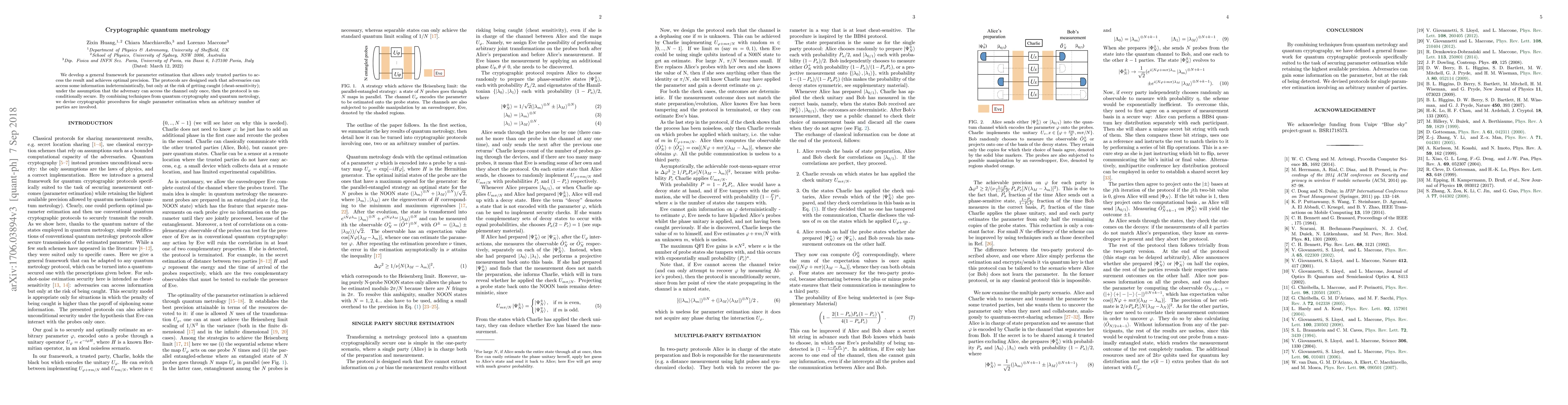 We develop a general framework for parameter estimation that allows only trusted parties to access the result and achieves optimal precision. The protocols are designed such that adversaries can access some information indeterministically, but only at the risk of getting caught (cheat-sensitivity); under the assumption that the adversary can access the channel only once, then the protocol is unconditionally secure. By combining techniques from quantum cryptography and quantum metrology, we devise cryptographic procedures for single parameter estimation when an arbitrary number of parties are involved.