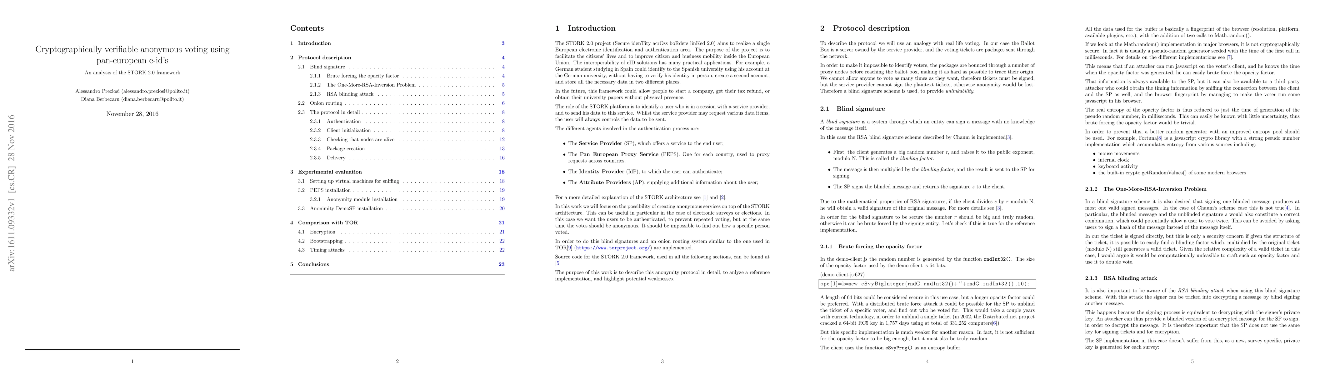 This paper proposes a method for cryptographically verifiable anonymous voting using pan-European e-IDs within the STORK framework, employing blind signatures and onion routing for anonymity. It details the protocol, analyzes a reference implementation, and discusses potential weaknesses with suggested improvements.