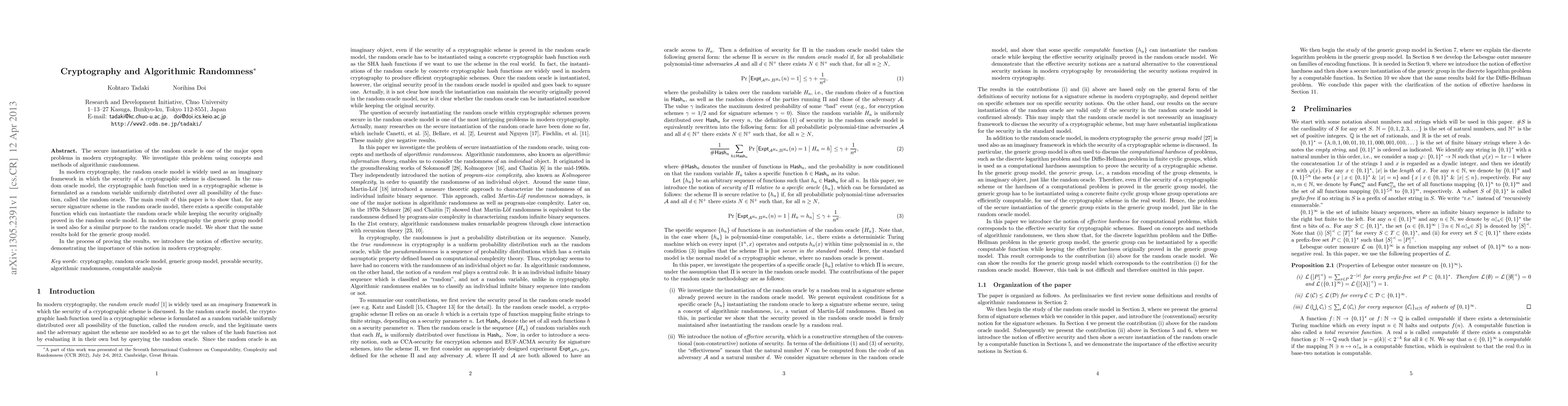 The secure instantiation of the random oracle is one of the major open problems in modern cryptography. We investigate this problem using concepts and methods of algorithmic randomness. In modern cryptography, the random oracle model is widely used as an imaginary framework in which the security of a cryptographic scheme is discussed. In the random oracle model, the cryptographic hash function used in a cryptographic scheme is formulated as a random variable uniformly distributed over all possibility of the function, called the random oracle. The main result of this paper is to show that, for any secure signature scheme in the random oracle model, there exists a specific computable function which can instantiate the random oracle while keeping the security originally proved in the random oracle model. In modern cryptography the generic group model is used also for a similar purpose to the random oracle model. We show that the same results hold for the generic group model. In the process of proving the results, we introduce the notion of effective security, demonstrating the importance of this notion in modern cryptography.