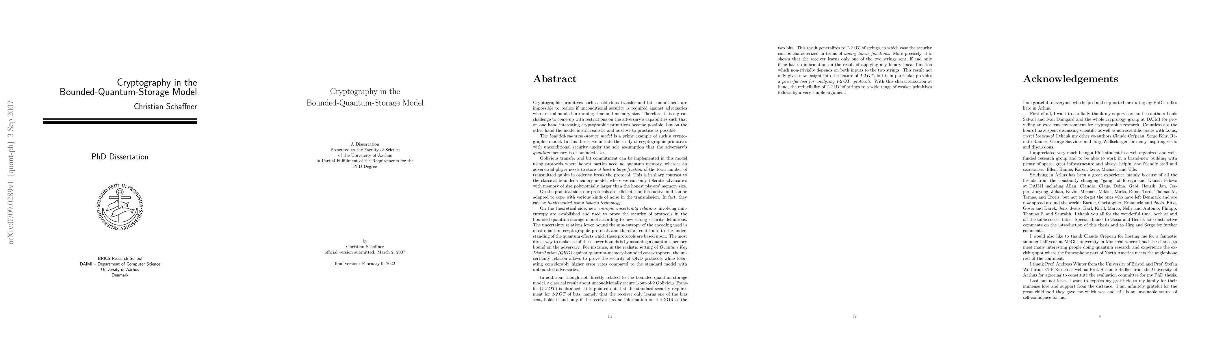 This thesis initiates the study of cryptographic protocols in the bounded-quantum-storage model. On the practical side, simple protocols for Rabin Oblivious Transfer, 1-2 Oblivious Transfer and Bit Commitment are presented. No quantum memory is required for honest players, whereas the protocols can only be broken by an adversary controlling a large amount of quantum memory. The protocols are efficient, non-interactive and can be implemented with today's technology. On the theoretical side, new entropic uncertainty relations involving min-entropy are established and used to prove the security of protocols according to new strong security definitions. For instance, in the realistic setting of Quantum Key Distribution (QKD) against quantum-memory-bounded eavesdroppers, the uncertainty relation allows to prove the security of QKD protocols while tolerating considerably higher error rates compared to the standard model with unbounded adversaries.