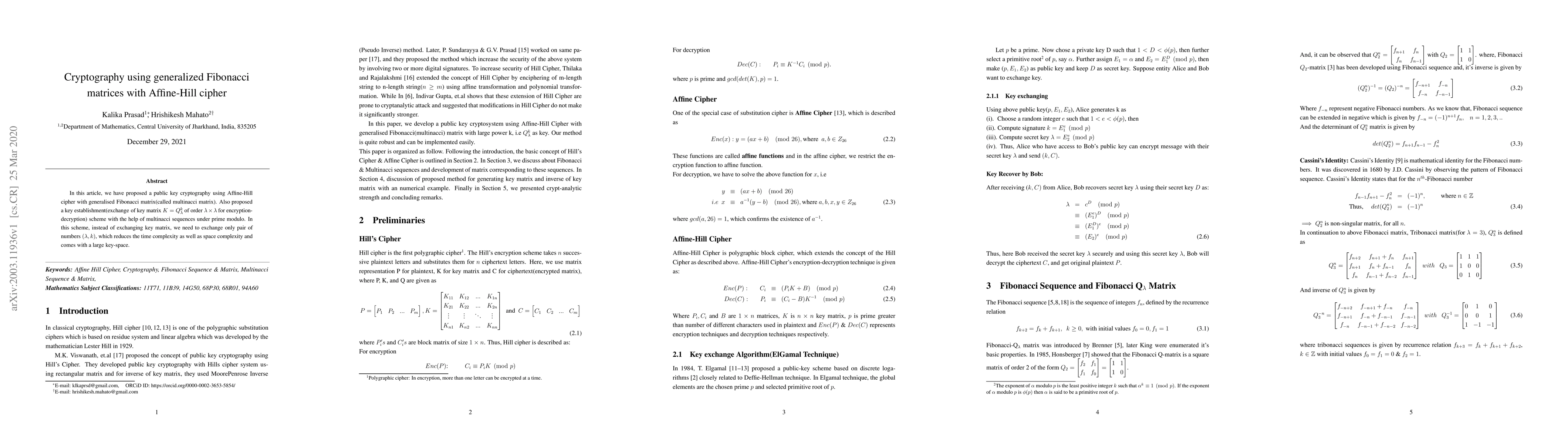 A public key cryptography scheme using Affine-Hill cipher with a generalized Fibonacci matrix (multinacci matrix) is proposed.
