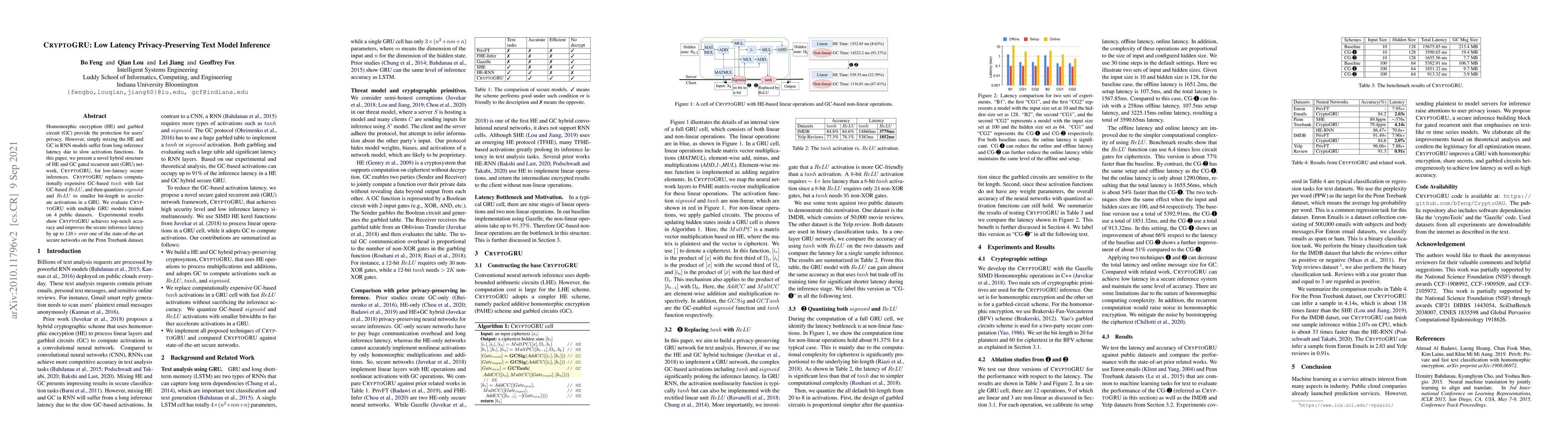 A new neural network architecture, CryptoGRU, achieves low-latency secure text analysis with improved accuracy, up to 138x faster than previous secure networks on public datasets.