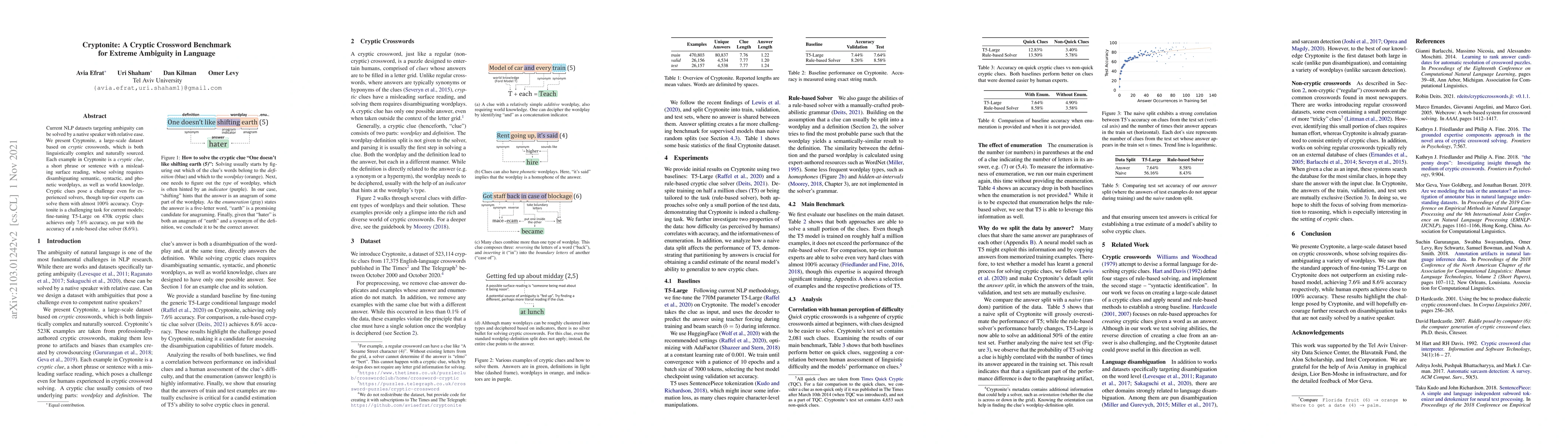 Cryptonite, a large-scale dataset of cryptic crossword clues, and the analysis of baseline performance on this dataset, providing insights into the challenges of linguistic ambiguity in NLP.