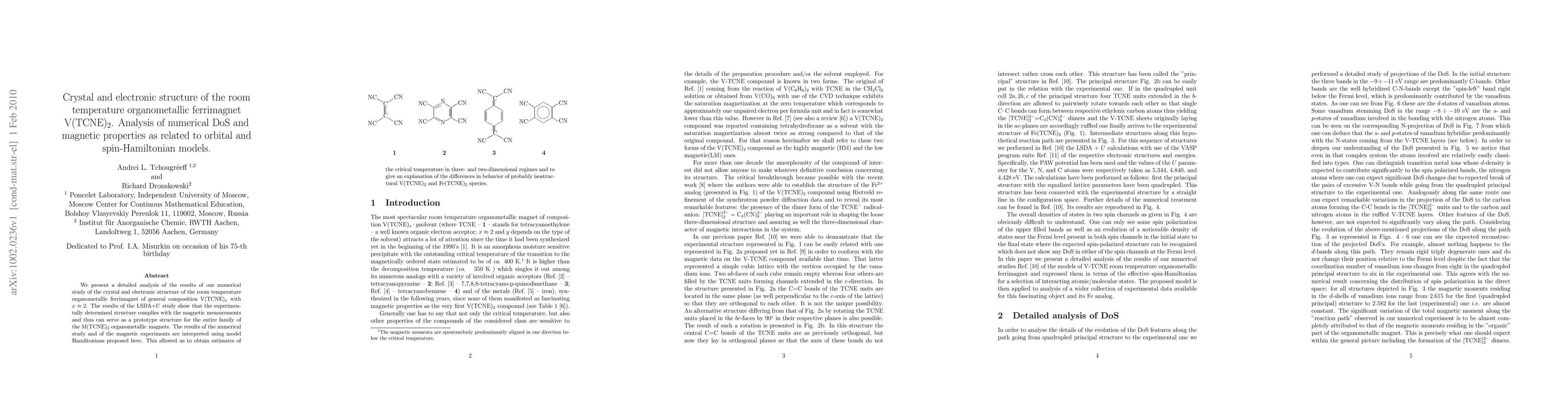 We present a detailed analysis of the results of our numerical study of the crystal and electronic structure of the room temperature organometallic ferrimagnet of general composition V(TCNE)$_{x}$ with $% x\approx 2$. The results of the LSDA+$U$ study show that the experimentally determined structure complies with the magnetic measurements and thus can serve as a prototype structure for the entire family of the M(TCNE)$_{2}$ organometallic magnets. The results of the numerical study and of the magnetic experiments are interpreted using model Hamiltonians proposed here. This allowed us to obtain estimates of the critical temperature in three- and two-dimensional regimes and to give an explanation of the differences in behavior of probably isostructural V(TCNE)$_{2}$ and Fe(TCNE)$_{2}$ species.