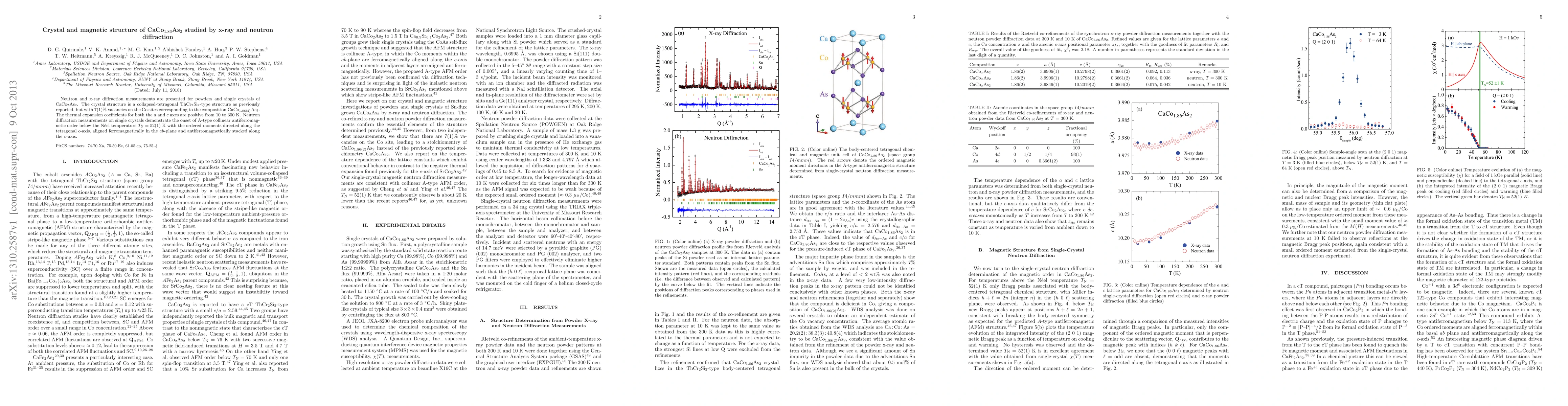 This study reveals the crystal structure of CaCo{1.86}As2 as a collapsed-tetragonal ThCr2Si2-type with Co site vacancies, and identifies a positive thermal expansion along both axes. Neutron diffraction shows A-type antiferromagnetic order below TN = 52(1) K, with moments aligned along the c-axis.