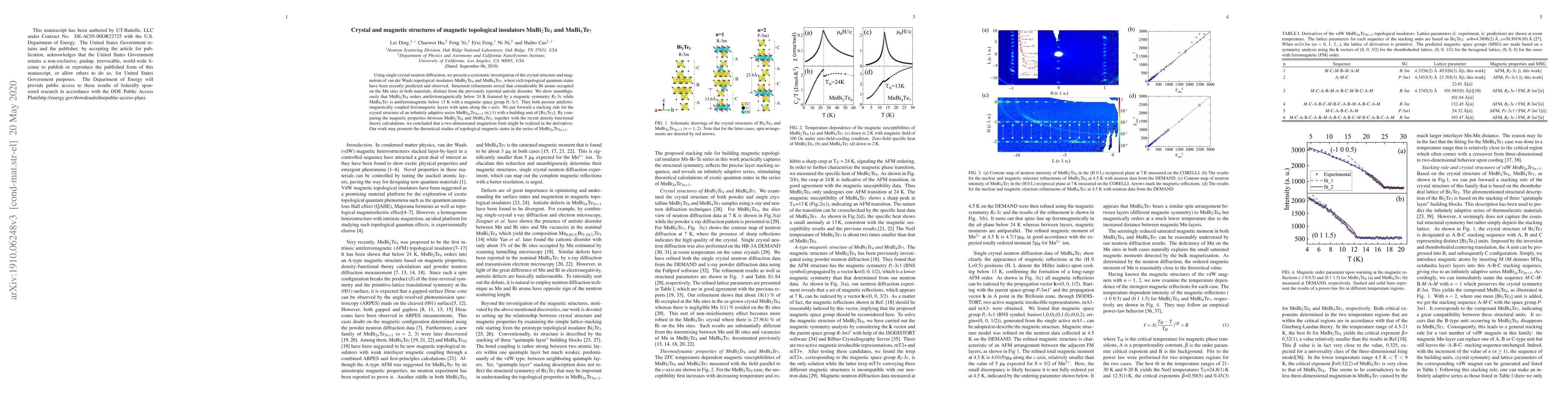Using single crystal neutron diffraction, we present a systematic investigation of the crystal structure and magnetism of van der Waals topological insulators MnBi$_2$Te$_4$ and MnBi$_4$Te$_7$, where rich topological quantum states have been recently predicted and observed. Structural refinements reveal that considerable Bi atoms occupied on the Mn sites in both materials, distinct from the previously reported antisite disorder. We show unambiguously that MnBi$_{2}$Te$_{4}$ orders antiferromagnetically below 24 K featured by a magnetic symmetry $R_I$-${3c}$ while MnBi$_{4}$Te$_{7}$ is antiferromagnetic below 13 K with a magnetic space group $P_c$-${3c1}$. They both present antiferromagnetically coupled ferromagnetic layers with spins along the $c$-axis. We put forward a stacking rule for the crystal structure of an infinitely adaptive series MnBi$_{2n}$Te$_{3n+1}$ (n$\geq$1) with the building unit of [Bi$_2$Te$_3$]. A comparison of magnetic properties between MnBi$_{2}$Te$_{4}$ and MnBi$_{4}$Te$_{7}$, together with the recent density-functional theory calculations, enables us to draw that a two-dimensional magnetism limit might be realized in the derivatives. Our work may promote the theoretical studies of topological magnetic states in the series of MnBi$_{2n}$Te$_{3n+1}$.