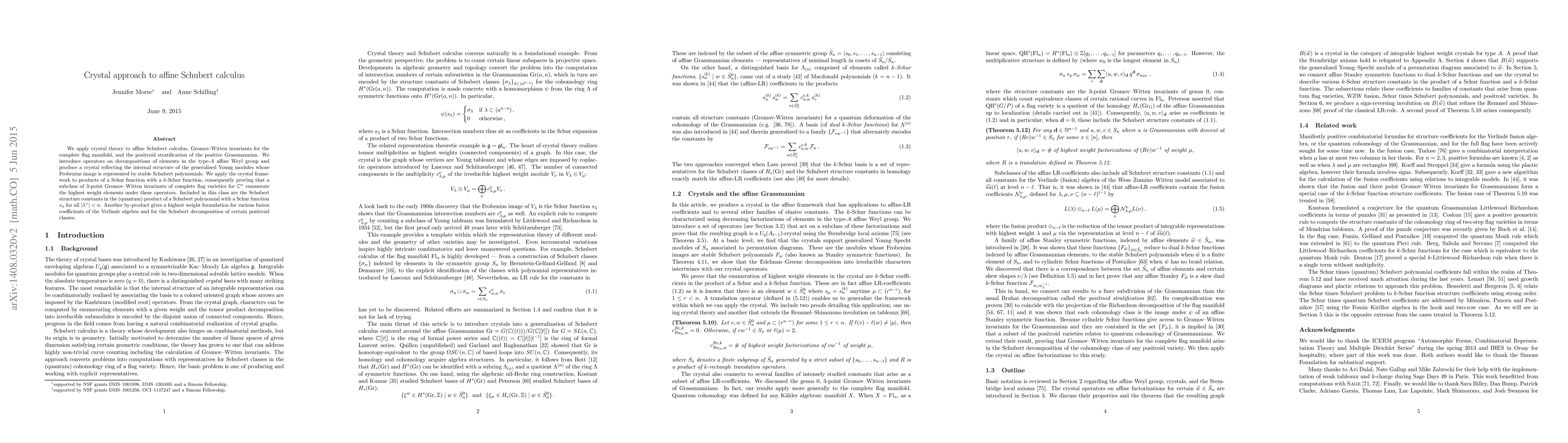 This paper utilizes crystal theory to explore affine Schubert calculus, establishing a crystal framework that reflects the internal structure of generalized Young modules and stable Schubert polynomials. It demonstrates that certain Gromov-Witten invariants enumerate highest weight elements, and also provides highest weight formulations for Verlinde algebra fusion coefficients and positroid classes.