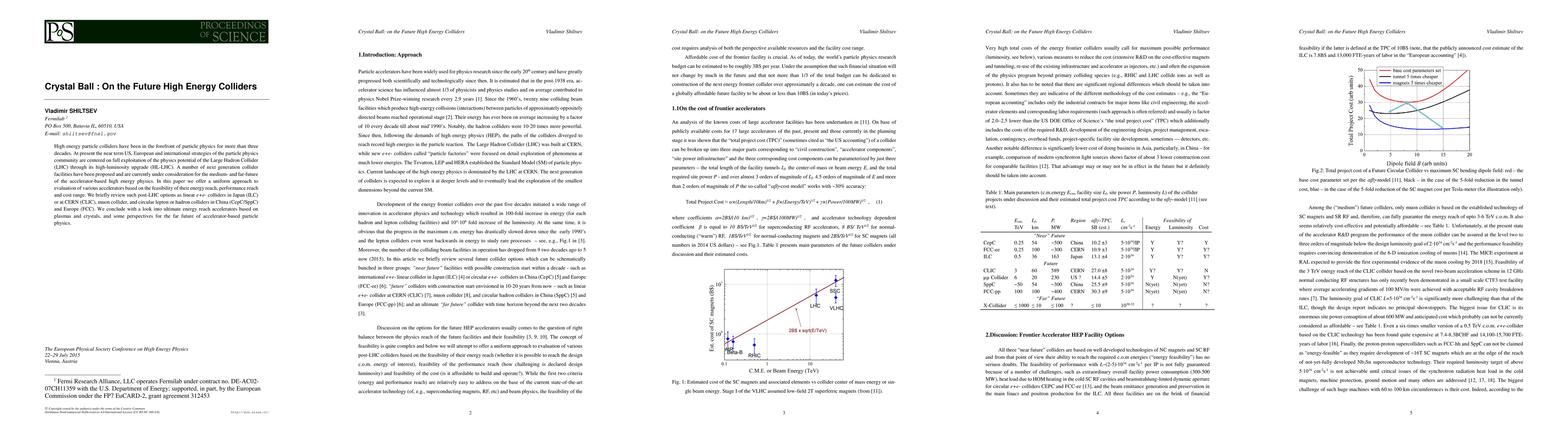 High energy particle colliders have been in the forefront of particle physics for more than three decades. At present the near term US, European and international strategies of the particle physics community are centered on full exploitation of the physics potential of the Large Hadron Collider (LHC) through its high-luminosity upgrade (HL-LHC). A number of next generation collider facilities have been proposed and are currently under consideration for the medium- and far-future of the accelerator-based high energy physics. In this paper we offer a uniform approach to evaluation of various accelerators based on the feasibility of their energy reach, performance reach and cost range. We briefly review such post-LHC options as linear e+e- colliders in Japan (ILC) or at CERN (CLIC), muon collider, and circular lepton or hadron colliders in China (CepC/SppC) and Europe (FCC). We conclude with a look into ultimate energy reach accelerators based on plasmas and crystals, and some perspectives for the far future of accelerator-based particle physics.