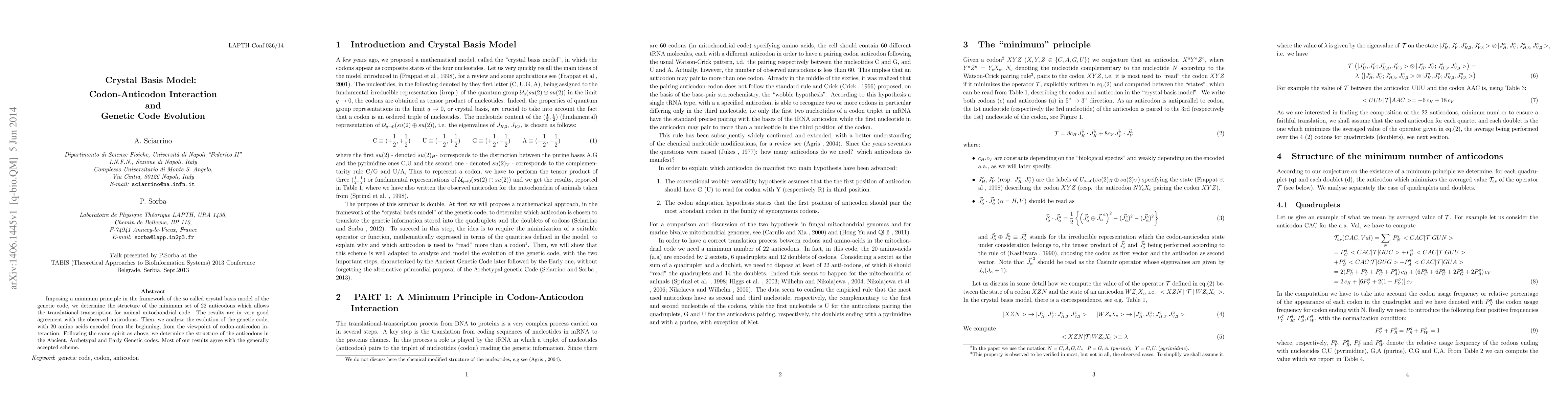 The paper employs the crystal basis model to analyze codon-anticodon interactions and the evolution of the genetic code. It determines the minimum set of 22 anticodons for animal mitochondrial translation and examines the Ancient, Archetypal, and Early Genetic codes.
