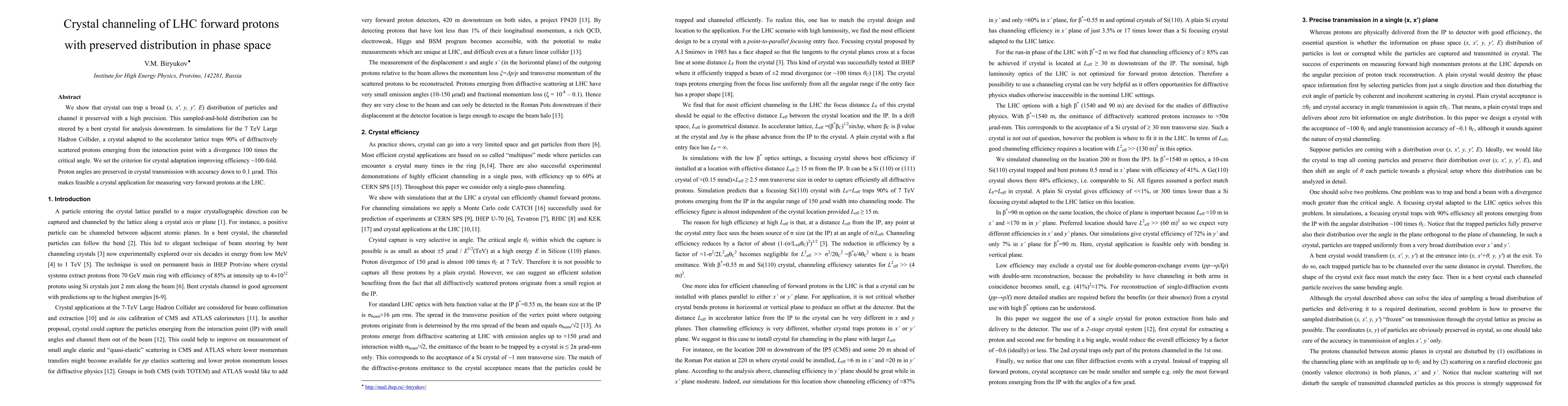 We show that crystal can trap a broad (x, x', y, y', E) distribution of particles and channel it preserved with a high precision. This sampled-and-hold distribution can be steered by a bent crystal for analysis downstream. In simulations for the 7 TeV Large Hadron Collider, a crystal adapted to the accelerator lattice traps 90% of diffractively scattered protons emerging from the interaction point with a divergence 100 times the critical angle. We set the criterion for crystal adaptation improving efficiency ~100-fold. Proton angles are preserved in crystal transmission with accuracy down to 0.1 microrad. This makes feasible a crystal application for measuring very forward protons at the LHC.