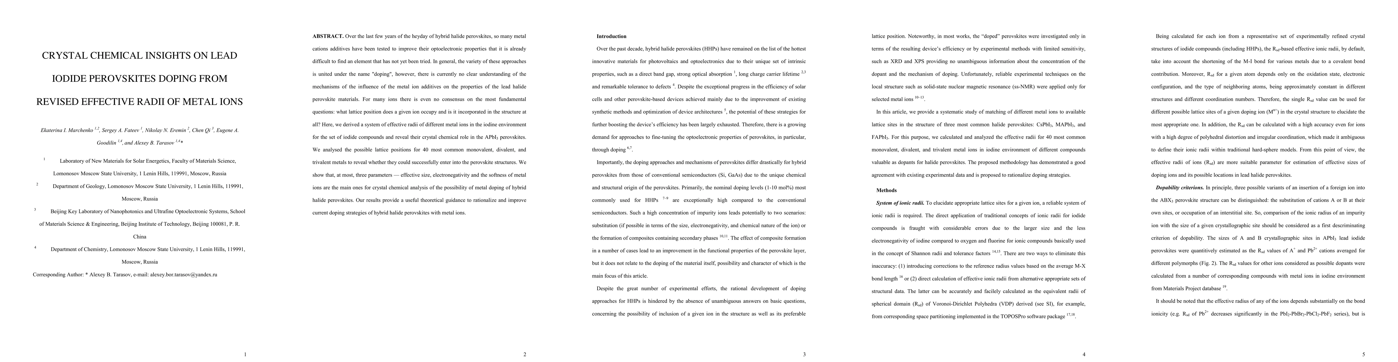 Over the last few years of the heyday of hybrid halide perovskites, so many metal cations additives have been tested to improve their optoelectronic properties that it is already difficult to find an element that has not yet been tried. In general, the variety of these approaches is united under the name "doping", however, there is currently no clear understanding of the mechanisms of the influence of the metal ion additives on the properties of the lead halide perovskite materials. For many ions there is even no consensus on the most fundamental questions: what lattice position does a given ion occupy and is it incorporated in the structure at all? Here, we derived a system of effective radii of different metal ions in the iodine environment for the set of iodide compounds and reveal their crystal chemical role in the APbI3 perovskites. We analysed the possible lattice positions for 40 most common monovalent, divalent, and trivalent metals to reveal whether they could successfully enter into the perovskite structures. We show that, at most, three parameters - effective size, electronegativity and the softness of metal ions are the main ones for crystal chemical analysis of the possibility of metal doping of hybrid halide perovskites. Our results provide a useful theoretical guidance to rationalize and improve current doping strategies of hybrid halide perovskites with metal ions.