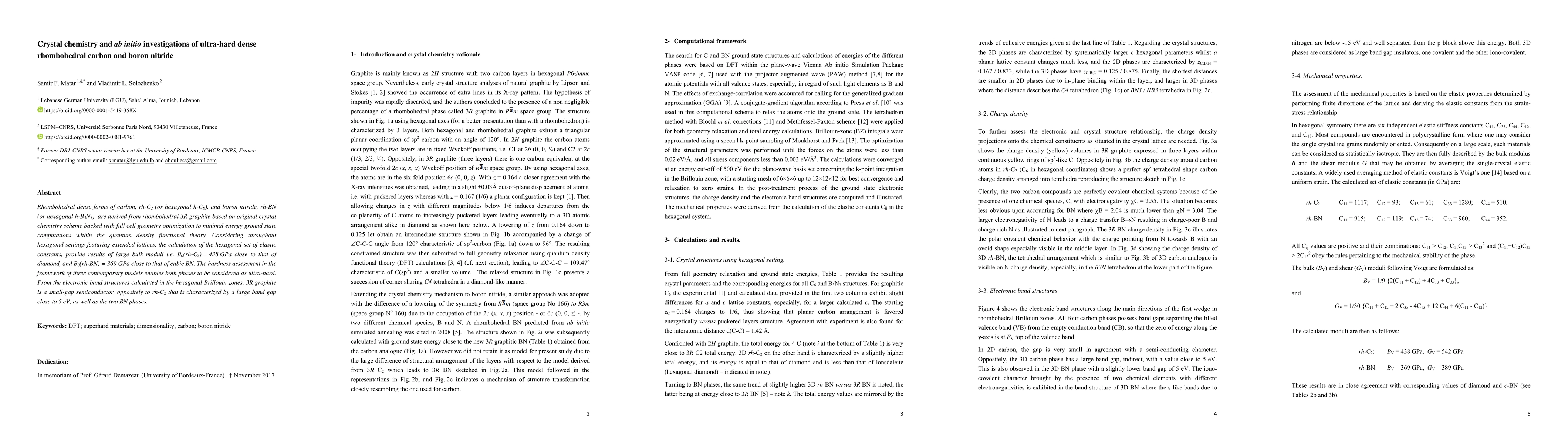 Rhombohedral dense forms of carbon, rh-C2 (or hexagonal h-C6), and boron nitride, rh-BN (or hexagonal h-B3N3), are derived from rhombohedral 3R graphite based on original crystal chemistry scheme backed with full cell geometry optimization to minimal energy ground state computations within the quantum density functional theory. Considering throughout hexagonal settings featuring extended lattices, the calculation of the hexagonal set of elastic constants, provide results of large bulk moduli i.e. B0(rh-C2) = 438 GPa close to that of diamond, and B0(rh-BN) = 369 GPa close to that of cubic BN. The hardness assessment in the framework of three contemporary models enables both phases to be considered as ultra-hard. From the electronic band structures calculated in the hexagonal Brillouin zones, 3R graphite is a small-gap semiconductor, oppositely to rh-C2 that is characterized by a large band gap close to 5 eV, as well as the two BN phases.