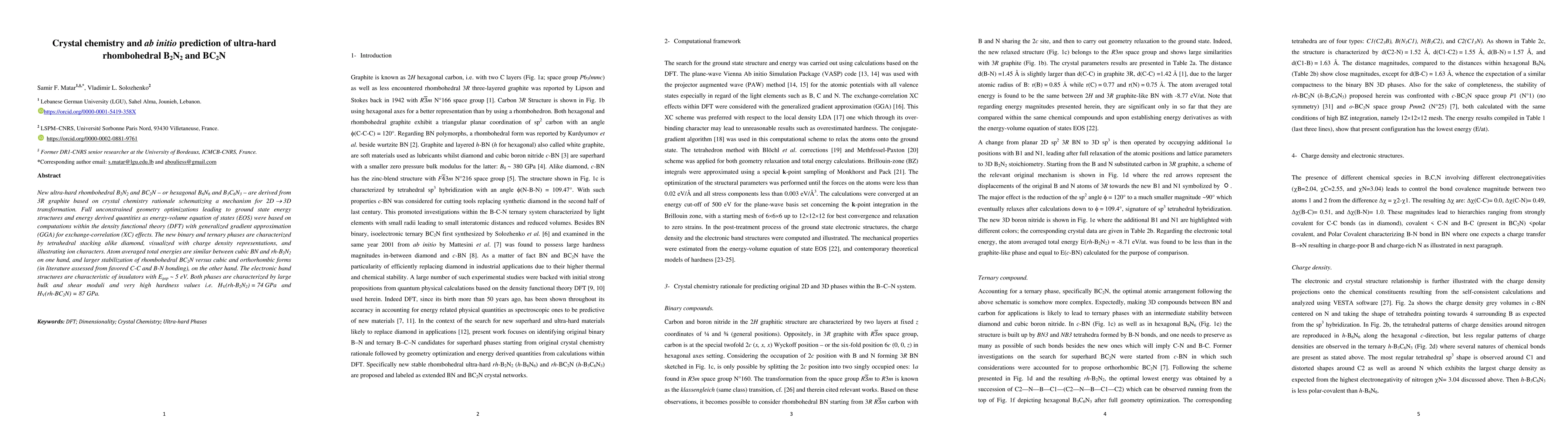 New ultra-hard rhombohedral B2N2 and BC2N - or hexagonal B6N6 and B3C6N3 - are derived from 3R graphite based on crystal chemistry rationale schematizing a mechanism for 2D => 3D transformation. Full unconstrained geometry optimizations leading to ground state energy structures and energy derived quantities as energy-volume equation of states (EOS) were based on computations within the density functional theory (DFT) with generalized gradient approximation (GGA) for exchange-correlation (XC) effects. The new binary and ternary phases are characterized by tetrahedral stacking alike diamond, visualized with charge density representations, and illustrating ion characters. Atom averaged total energies are similar between cubic BN and rh-B2N2 on one hand, and larger stabilization of rhombohedral BC2N versus cubic and orthorhombic forms (in literature assessed from favored C-C and B-N bonding), on the other hand. The electronic band structures are characteristic of insulators with Egap ~ 5 eV. Both phases are characterized by large bulk and shear moduli and very high hardness values i.e. HV(rh-B2N2) = 74 GPa and HV(rh-BC2N) = 87 GPa.
