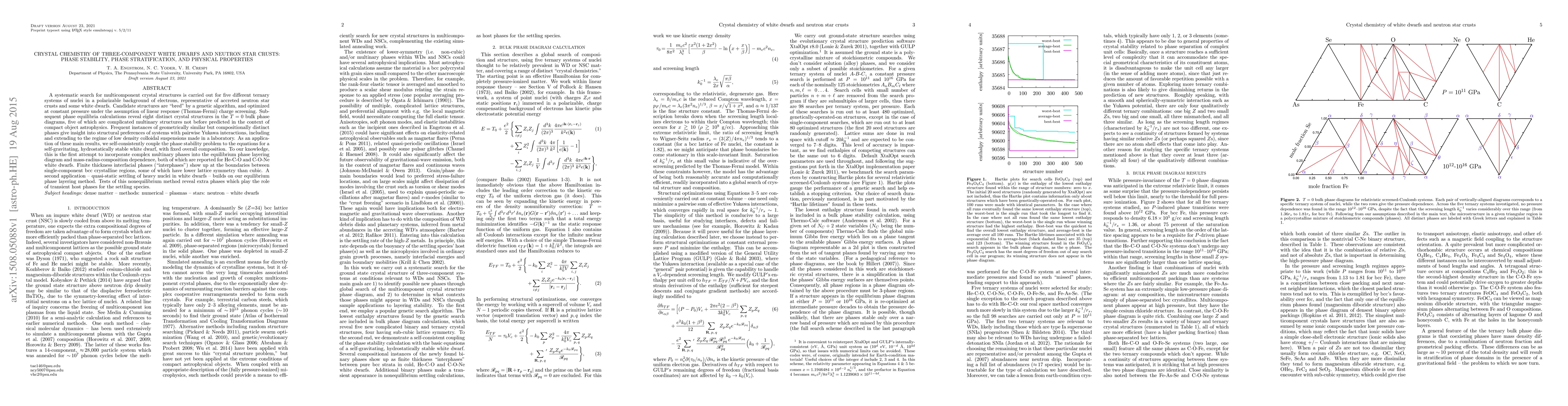 A systematic search for multicomponent crystal structures is carried out for five different ternary systems of nuclei in a polarizable background of electrons, representative of accreted neutron star crusts and some white dwarfs. Candidate structures are "bred" by a genetic algorithm, and optimized at constant pressure under the assumption of linear response (Thomas-Fermi) charge screening. Subsequent phase equilibria calculations reveal eight distinct crystal structures in the $T=0$ bulk phase diagrams, five of which are complicated multinary structures not before predicted in the context of compact object astrophysics. Frequent instances of geometrically similar but compositionally distinct phases give insight into structural preferences of systems with pairwise Yukawa interactions, including and extending to the regime of low density colloidal suspensions made in a laboratory. As an application of these main results, we self-consistently couple the phase stability problem to the equations for a self-gravitating, hydrostatically stable white dwarf, with fixed overall composition. To our knowledge, this is the first attempt to incorporate complex multinary phases into the equilibrium phase layering diagram and mass-radius-composition dependence, both of which are reported for He-C-O and C-O-Ne white dwarfs. Finite thickness interfacial phases ("interphases") show up at the boundaries between single-component bcc crystalline regions, some of which have lower lattice symmetry than cubic. A second application -- quasi-static settling of heavy nuclei in white dwarfs -- builds on our equilibrium phase layering method. Tests of this nonequilibrium method reveal extra phases which play the role of transient host phases for the settling species.