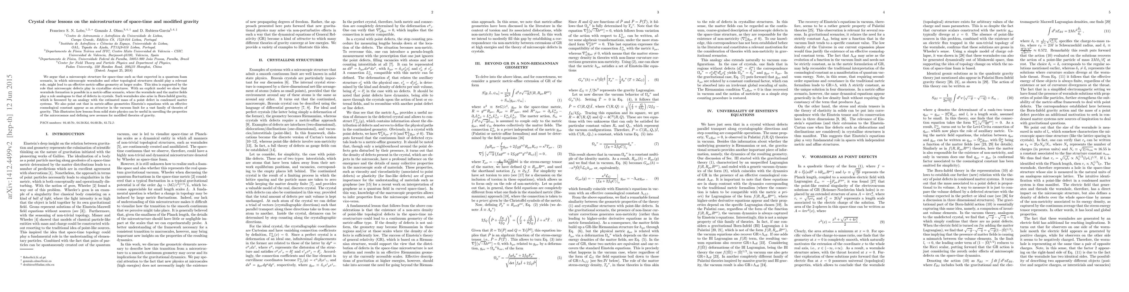 We argue that a microscopic structure for space-time such as that expected in a quantum foam scenario, in which microscopic wormholes and other topological structures should play a relevant role, might lead to an effective metric-affine geometry at larger scales. This idea is supported by the role that microscopic defects play in crystalline structures. With an explicit model we show that wormhole formation is possible in a metric-affine scenario, where the wormhole and the matter fields play a role analogous to that of defects in crystals. We also point out that in metric-affine geometries Einstein's equations with an effective cosmological constant appear as an attractor in the vacuum limit for a vast family of theories of gravity. This illustrates how lessons from solid state physics can be useful in unveiling the properties of the microcosmos and defining new avenues for modified theories of gravity.