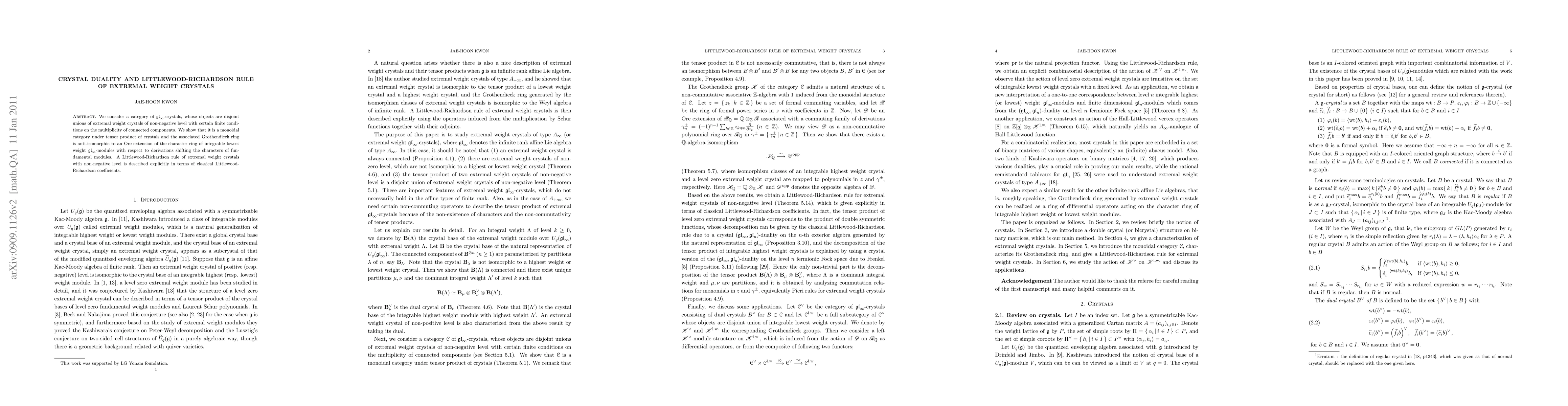 We consider a category of $\gl_\infty$-crystals, whose objects are disjoint unions of extremal weight crystals of non-negative level with certain finite conditions on the multiplicity of connected components. We show that it is a monoidal category under tensor product of crystals and the associated Grothendieck ring is anti-isomorphic to an Ore extension of the character ring of integrable lowest weight $\gl_\infty$-modules with respect to derivations shifting the characters of fundamental modules. A Littlewood-Richardson rule of extremal weight crystals with non-negative level is described explicitly in terms of classical Littlewood-Richardson coefficients.