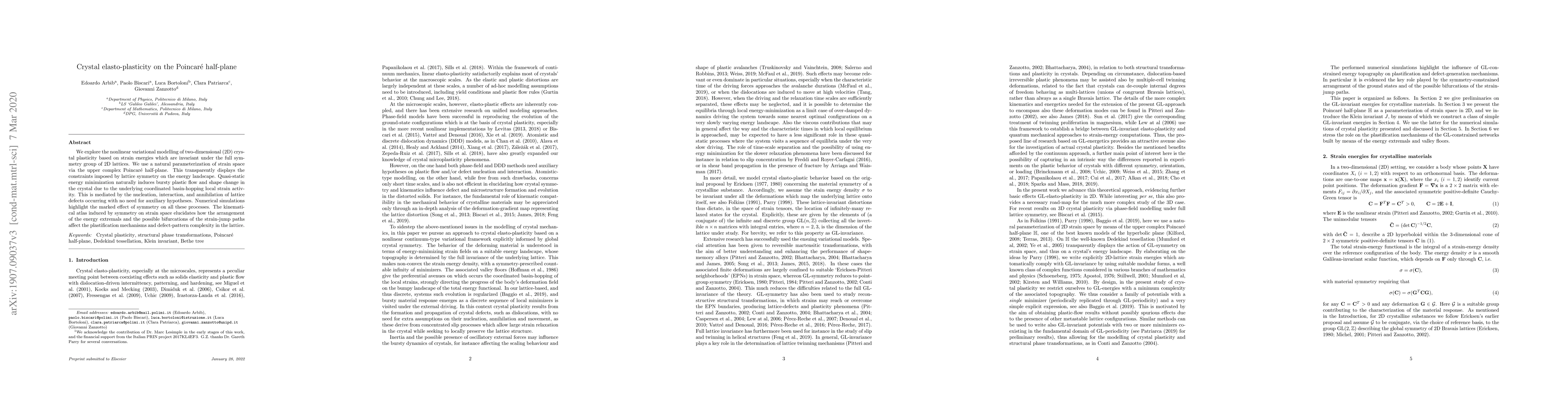 The research explores nonlinear variational modeling of 2D crystal plasticity using strain energies invariant under the full symmetry group of 2D lattices, parameterized via the upper complex Poincaré half-plane, which transparently displays lattice symmetry constraints on the energy landscape.