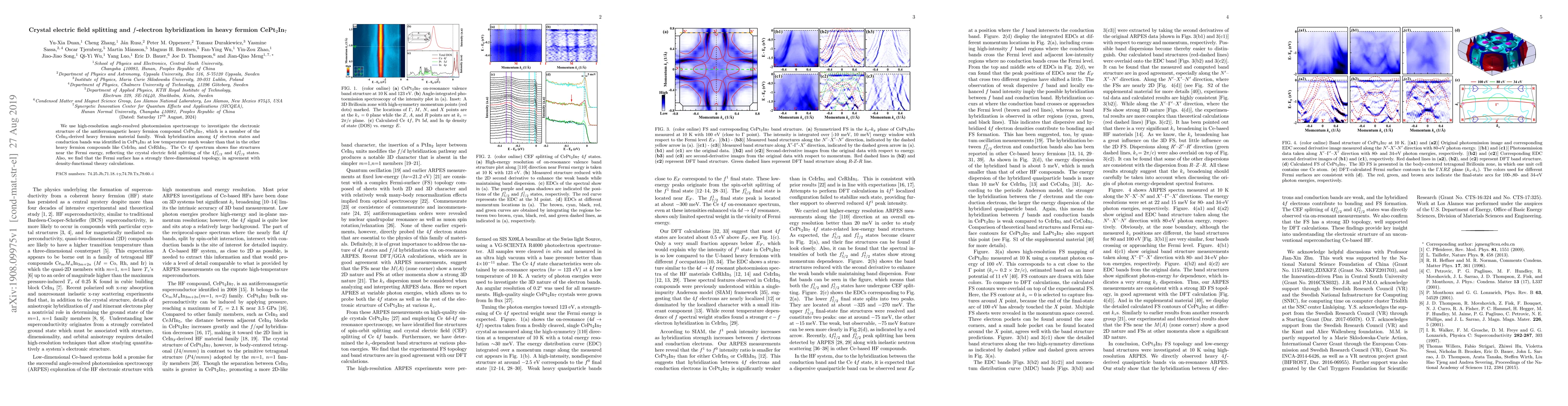 This study uses high-resolution angle-resolved photoemission spectroscopy to reveal weak hybridization and crystal electric field splitting in the electronic structure of CePt2In7, a heavy fermion compound with a three-dimensional Fermi surface topology. The Ce 4f spectrum shows fine structures indicating splitting of its 4f states.