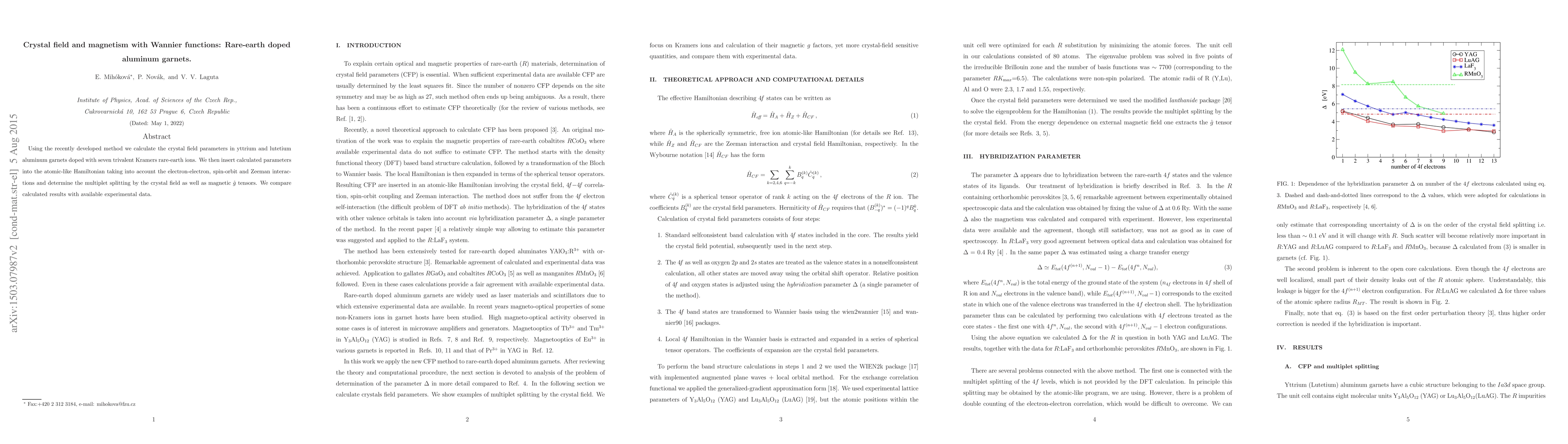 This paper calculates crystal field parameters in rare-earth doped aluminum garnets using Wannier functions and determines multiplet splitting and magnetic tensors, comparing these results with experimental data. The focus is on understanding magnetism and crystal field effects in these materials.