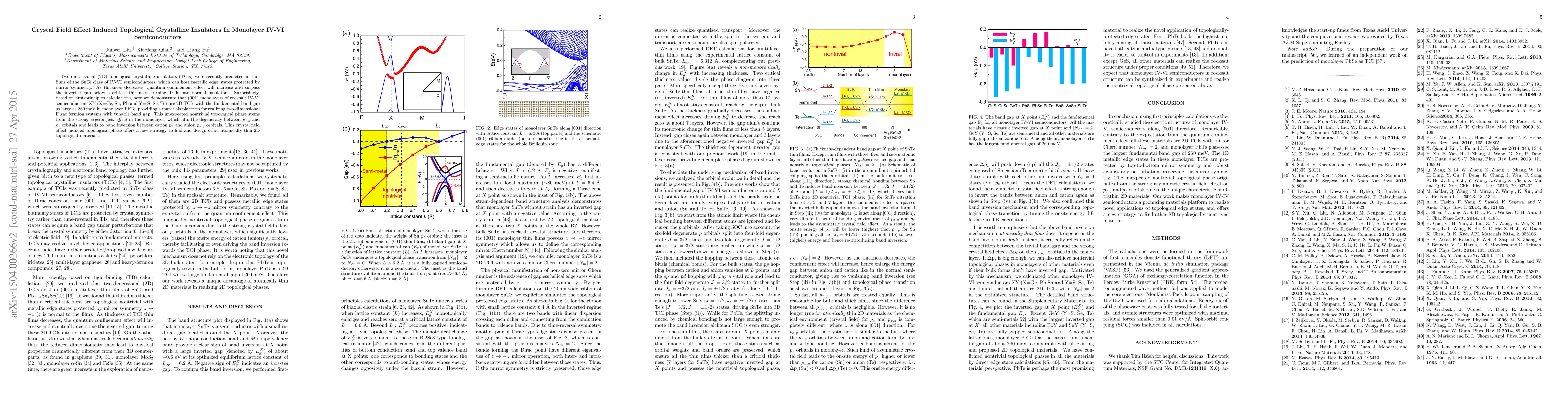 This paper demonstrates that monolayer IV-VI semiconductors like PbTe can serve as two-dimensional topological crystalline insulators with large band gaps, due to the crystal field effect lifting orbital degeneracy and inducing band inversion. This effect offers a new approach to designing other thin 2D topological materials.