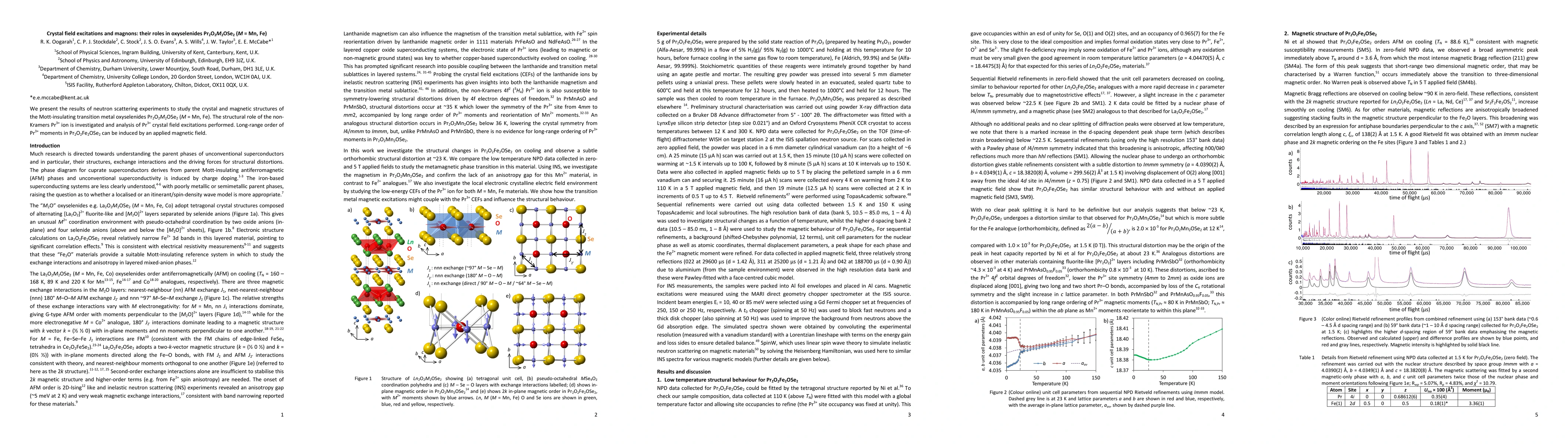 We present the results of neutron scattering experiments to study the crystal and magnetic structures of the Mott-insulating transition metal oxyselenides Pr2O2M2OSe2 (M = Mn, Fe). The structural role of the non-Kramers Pr3+ ion is investigated and analysis of Pr3+ crystal field excitations performed. Long-range order of Pr3+ moments in Pr2O2Fe2OSe2 can be induced by an applied magnetic field.