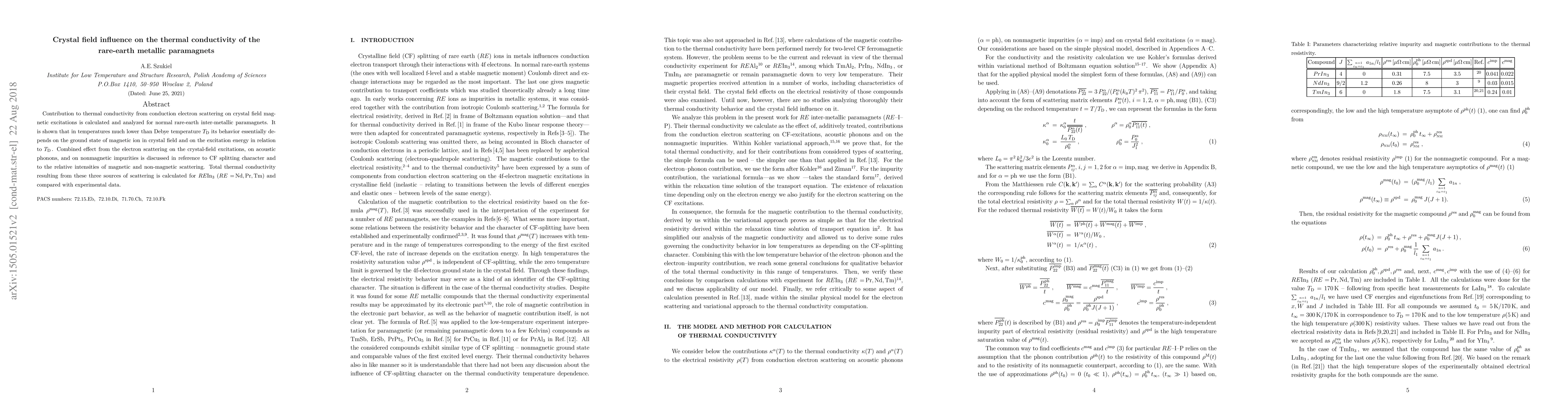 Contribution to thermal conductivity from conduction electron scattering on crystal field magnetic excitations is calculated and analyzed for normal rare-earth inter-metallic paramagnets. It is shown that in temperatures much lower than Debye temperature $\TD$ its behavior essentially depends on the ground state of magnetic ion in crystal field and on the excitation energy in relation to $\TD$\,. Combined effect from the electron scattering on the crystal-field excitations, on acoustic phonons, and on nonmagnetic impurities is discussed in reference to CF splitting character and to the relative intensities of magnetic and non-magnetic scattering. Total thermal conductivity resulting from these three sources of scattering is calculated for $RE$In$_3$ ($RE=\,$Nd,\,Pr,\,Tm) and compared with experimental data.