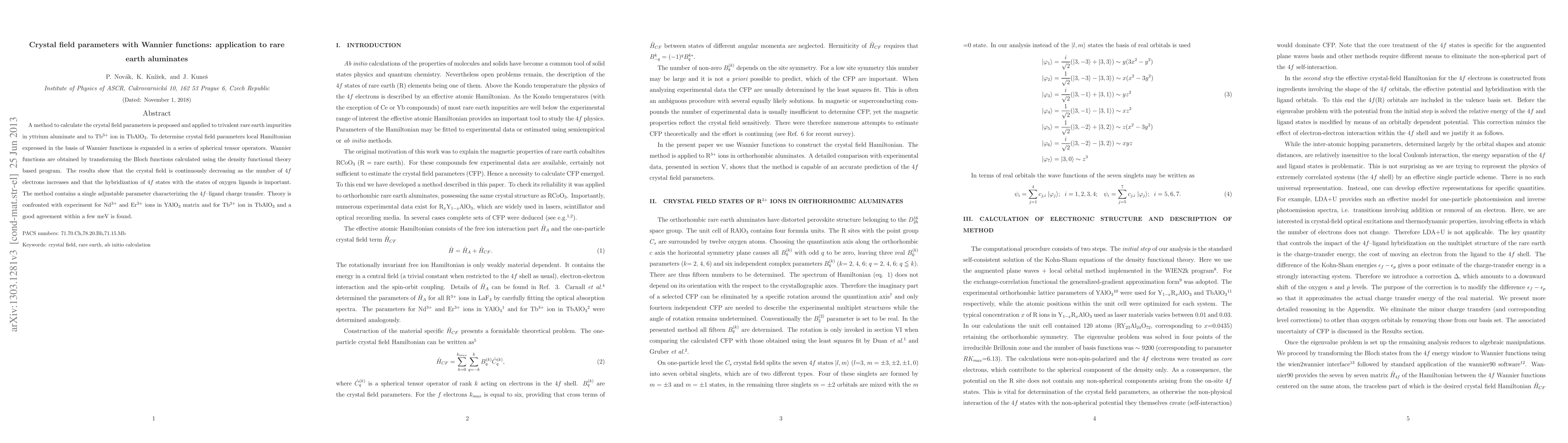 A method to calculate the crystal field parameters {\it ab initio} is proposed and applied to trivalent rare earth impurities in yttrium aluminate and to Tb$^{3+}$ ion in TbAlO$_3$. To determine crystal field parameters local Hamiltonian expressed in basis of Wannier functions is expanded in a series of spherical tensor operators. Wannier functions are obtained by transforming the Bloch functions calculated using the density functional theory based program. The results show that the crystal field is continuously decreasing as the number of $4f$ electrons increases and that the hybridization of $4f$ states with the states of oxygen ligands is important. Theory is confronted with experiment for Nd$^{3+}$ and Er$^{3+}$ ions in YAlO$_3$ and for Tb$^{3+}$ ion in TbAlO$_3$ and a fair agreement is found.