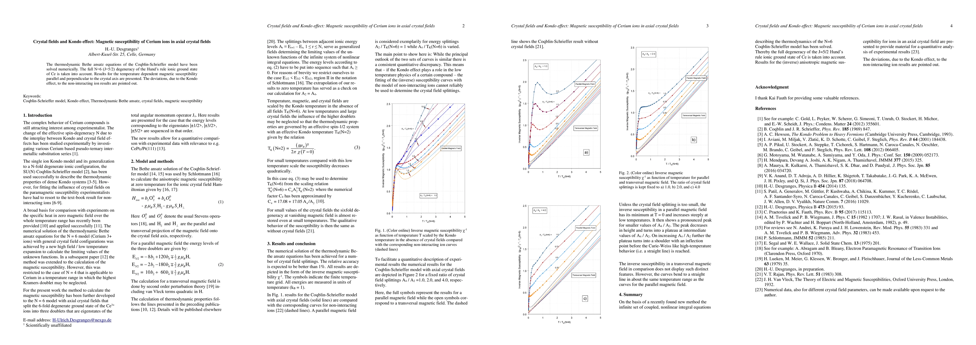 The paper numerically solves Bethe ansatz equations of the Coqblin-Schrieffer model for cerium ions in axial crystal fields, considering full Hund's rule ground state degeneracy. It presents temperature-dependent magnetic susceptibility results parallel and perpendicular to the crystal axis, highlighting Kondo effect deviations from non-interacting ion results.