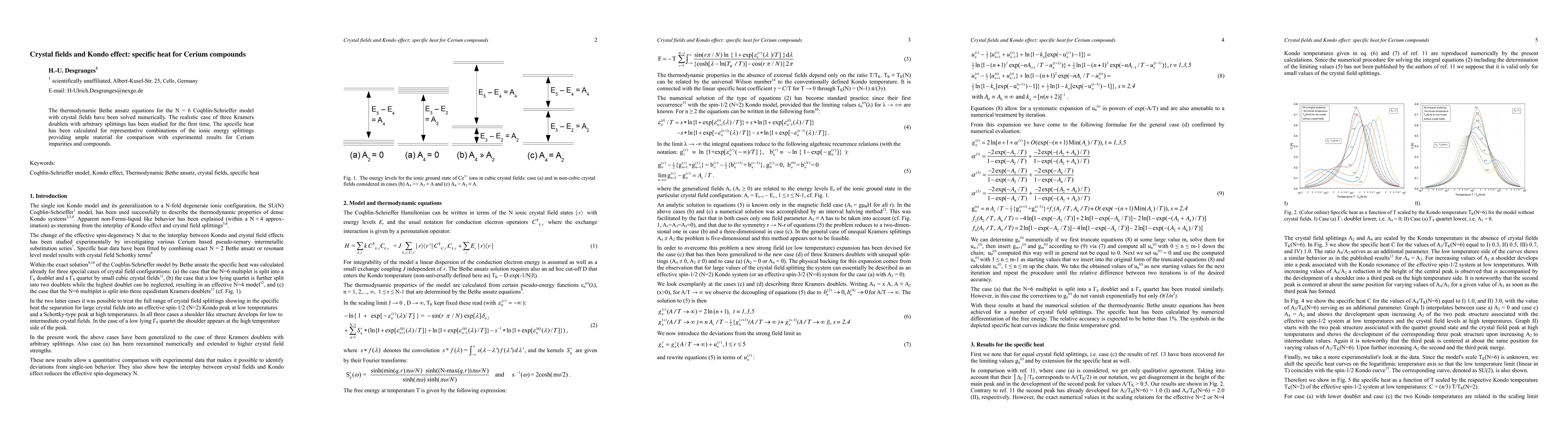 The thermodynamic Bethe ansatz equations for the N = 6 Coqblin-Schrieffer model with crystal fields have been solved numerically. The realistic case of three Kramers doublets with arbitrary splittings has been studied for the first time. The specific heat has been calculated for representative combinations of the ionic energy splittings providing ample material for comparison with experimental results for Cerium impurities and compounds.