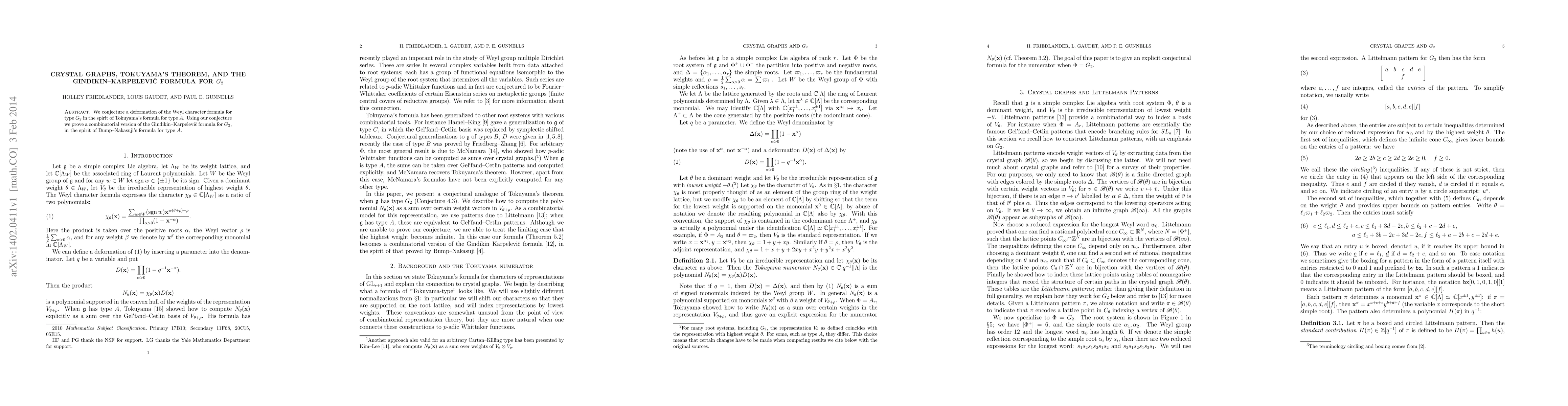 We conjecture a deformation of the Weyl character formula for type G_2 in the spirit of Tokuyama's formula for type A. Using our conjecture we prove a combinatorial version of the Gindikin--Karpelevic formula for G_2, in the spirit of Bump--Nakasuji's formula for type A.