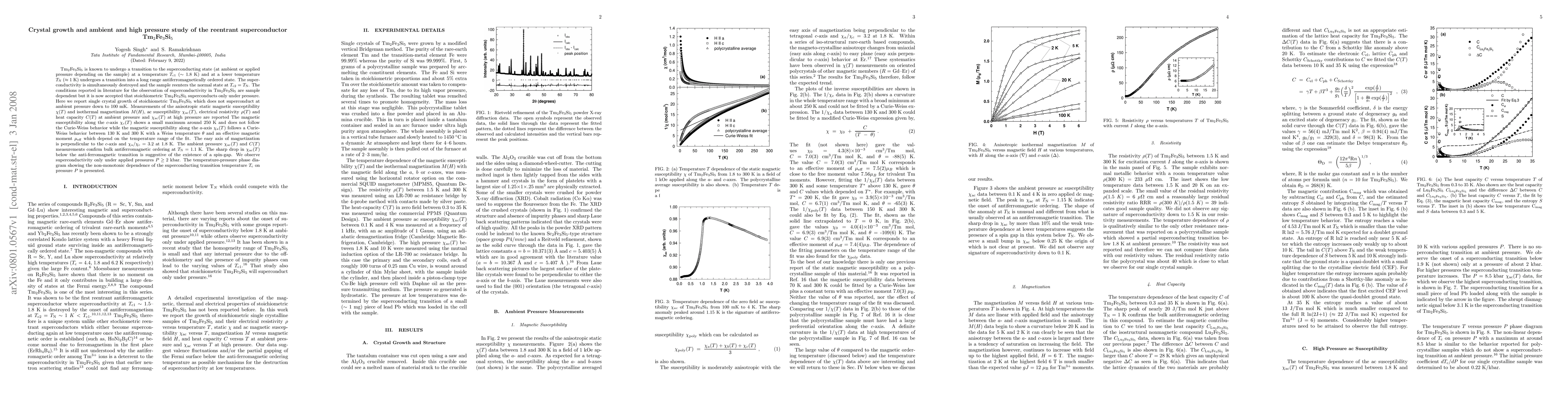 We report single crystal growth of the reentrant superconductor Tm_2Fe_3Si_5, and measurements of the anisotropic static magnetic susceptibility \chi(T) and isothermal magnetization M(H), ac susceptibility \chi_ac(T), electrical resistivity \rho(T) and heat capacity C(T) at ambient pressure and \chi_ac(T) at high pressure. The magnetic susceptibility along the c-axis \chi_c(T) shows a small maximum around 250 K and does not follow the Curie-Weiss behavior while the magnetic susceptibility along the a-axis \chi_a(T) follows a Curie-Weiss behavior between 130 K and 300 K with a Weiss temperature \theta and an effective magnetic moment \mu_eff which depend on the temperature range of the fit. The easy axis of magnetization is perpendicular to the c-axis and \chi_a/\chi_c = 3.2 at 1.8 K. The ambient pressure \chi_ac(T) and C(T) measurements confirm bulk antiferromagnetic ordering at T_N = 1.1 K. The sharp drop in \chi_ac below T_N is suggestive of the existence of a spin-gap. We observe superconductivity only under applied pressures P\geq 2 kbar. The temperature-pressure phase diagram showing the non-monotonic dependence of the superconducting transition temperature T_c on pressure P is presented.