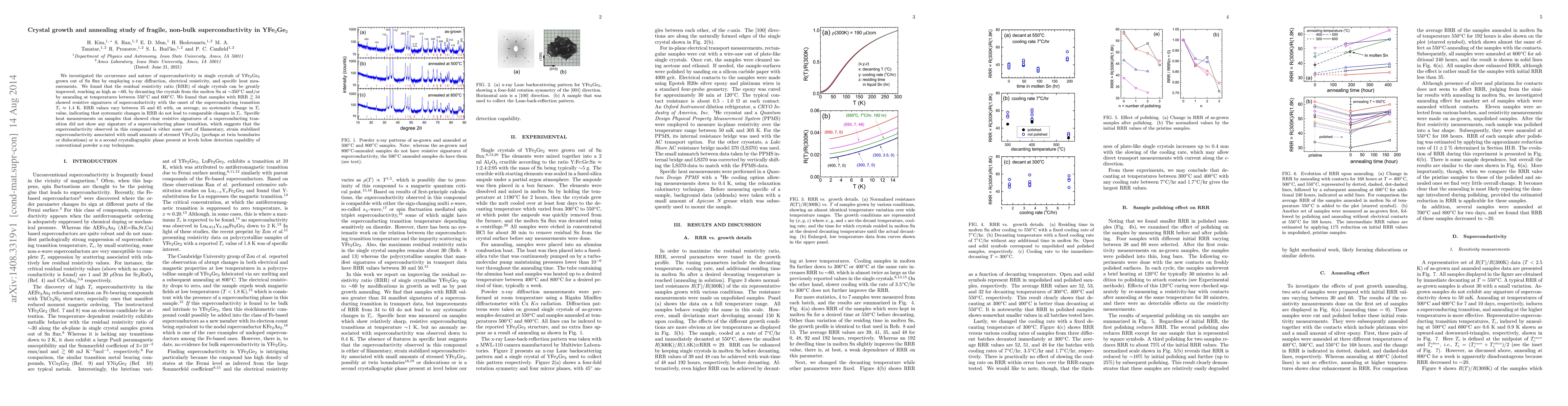 We investigated the occurrence and nature of superconductivity in single crystals of YFe$_2$Ge$_2$ grown out of Sn flux by employing x-ray diffraction, electrical resistivity, and specific heat measurements. We found that the residual resistivity ratio (RRR) of single crystals can be greatly improved, reaching as high as $\sim$60, by decanting the crystals from the molten Sn at $\sim$350$^\circ$C and/or by annealing at temperatures between 550$^\circ$C and 600$^\circ$C. We found that samples with RRR $\gtrsim$ 34 showed resistive signatures of superconductivity with the onset of the superconducting transition $T_c\approx1.4$ K. RRR values vary between 35 and 65 with, on average, no systematic change in $T_c$ value, indicating that systematic changes in RRR do not lead to comparable changes in $T_c$. Specific heat measurements on samples that showed clear resistive signatures of a superconducting transition did not show any signature of a superconducting phase transition, which suggests that the superconductivity observed in this compound is either some sort of filamentary, strain stabilized superconductivity associated with small amounts of stressed YFe$_2$Ge$_2$ (perhaps at twin boundaries or dislocations) or is a second crystallographic phase present at levels below detection capability of conventional powder x-ray techniques.